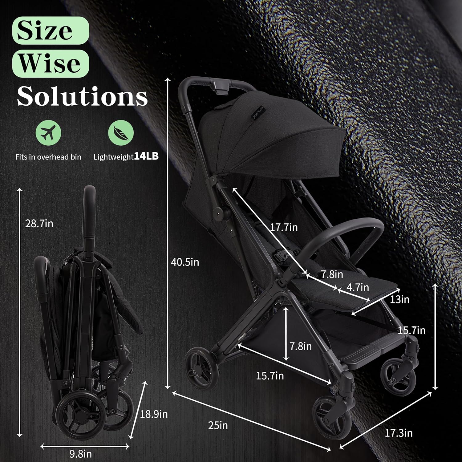 Airplane Stroller:Travel stroller for airplane folds super small 21.65*19.3*9.45 inches,only 13lbs fit all different airlines overhead bins.Travel stroller went through airport security easily,making it easy to carry and store,is baby travel airplane essentials!