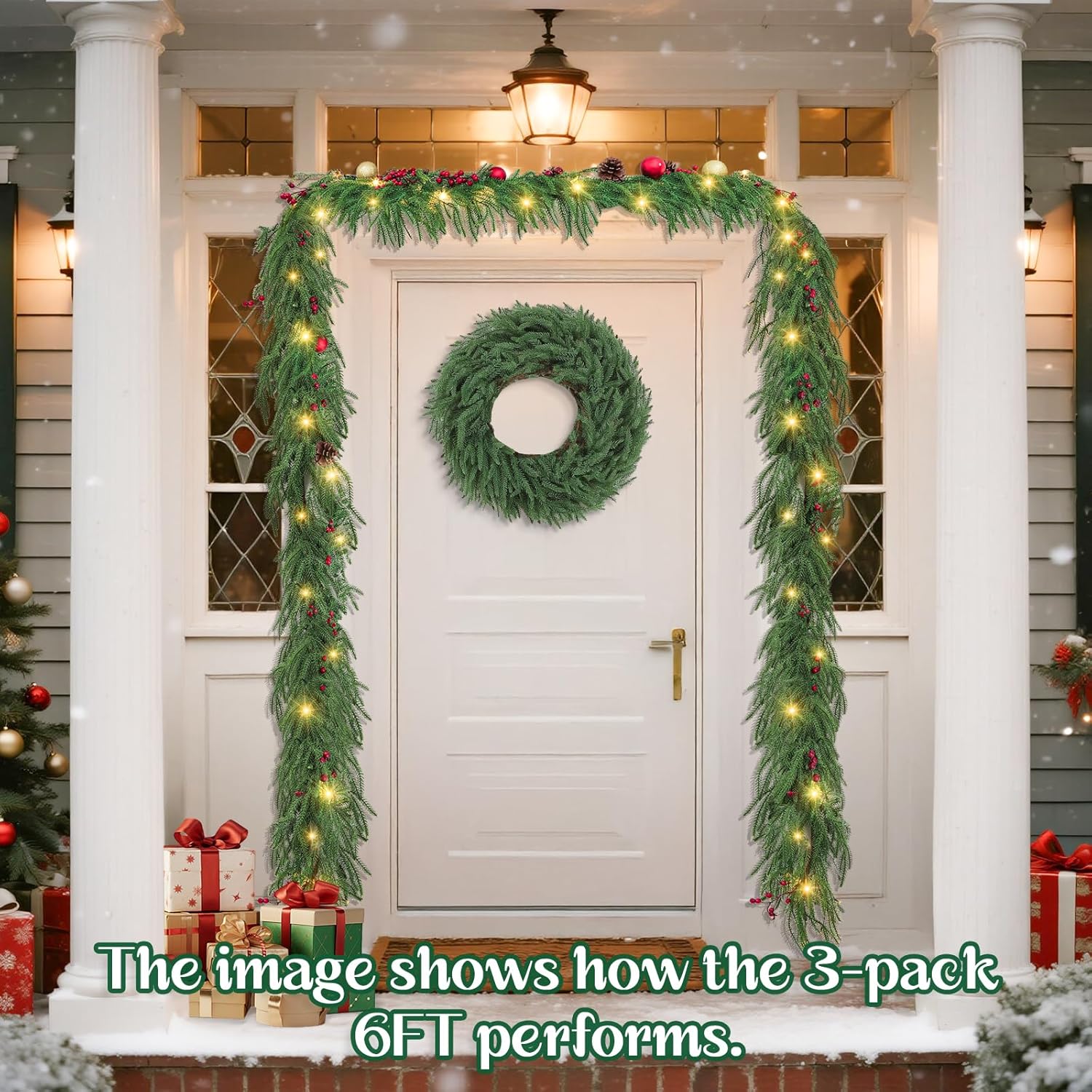 Pre-Lit Design :This winter garland features bright warm LED lights spanning 6.5 feet. Powered by 3 AA batteries (not included), it offers cordless convenience with no tangled wires or outlet concerns, ensuring safe and easy use.