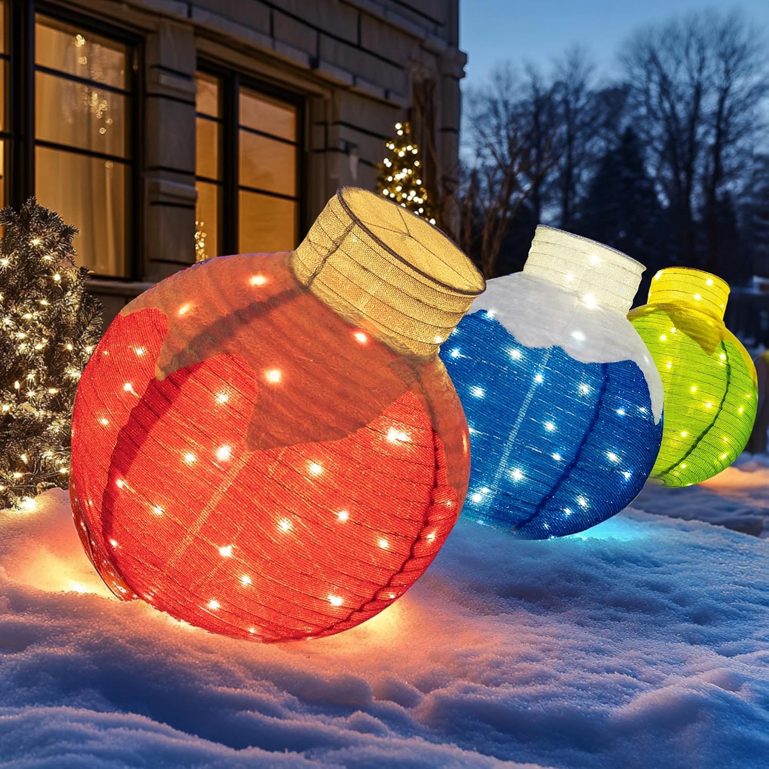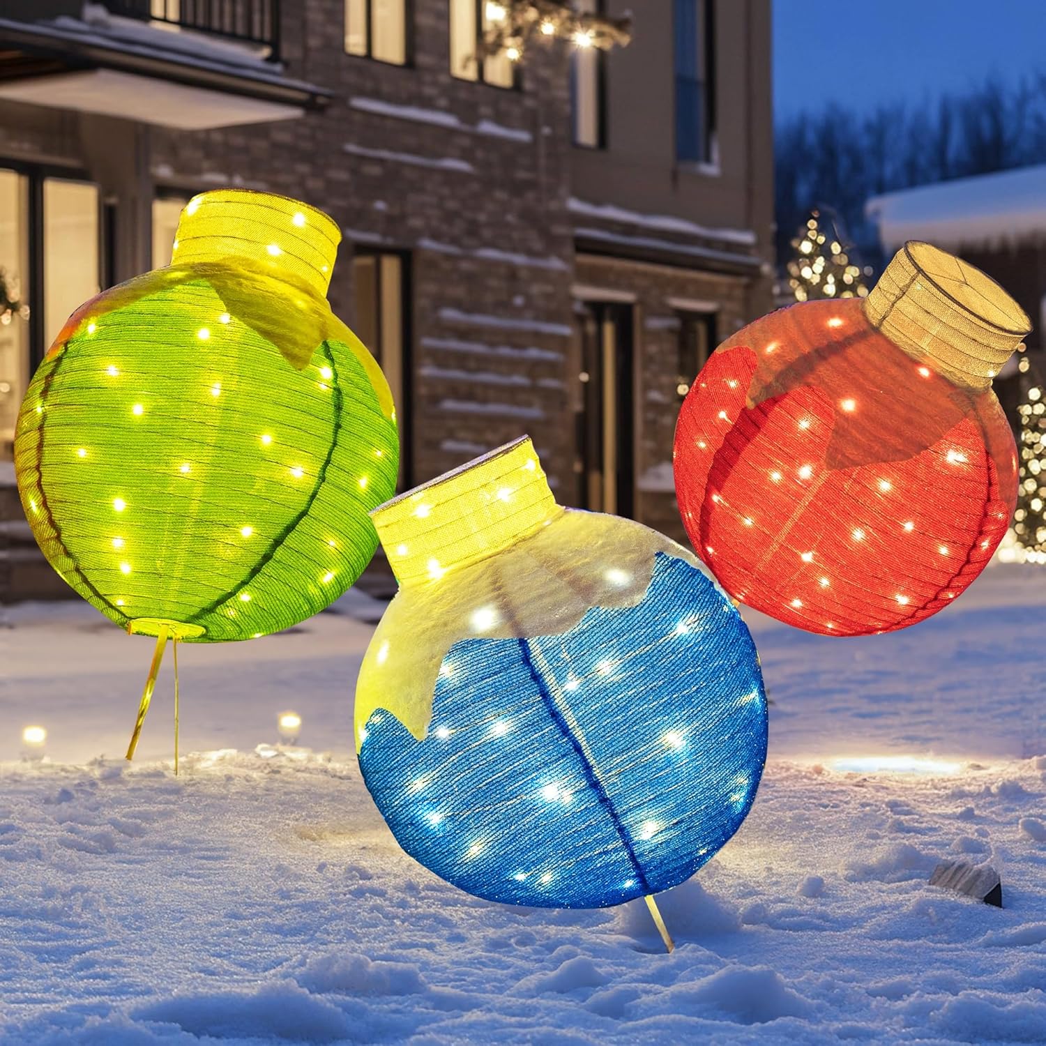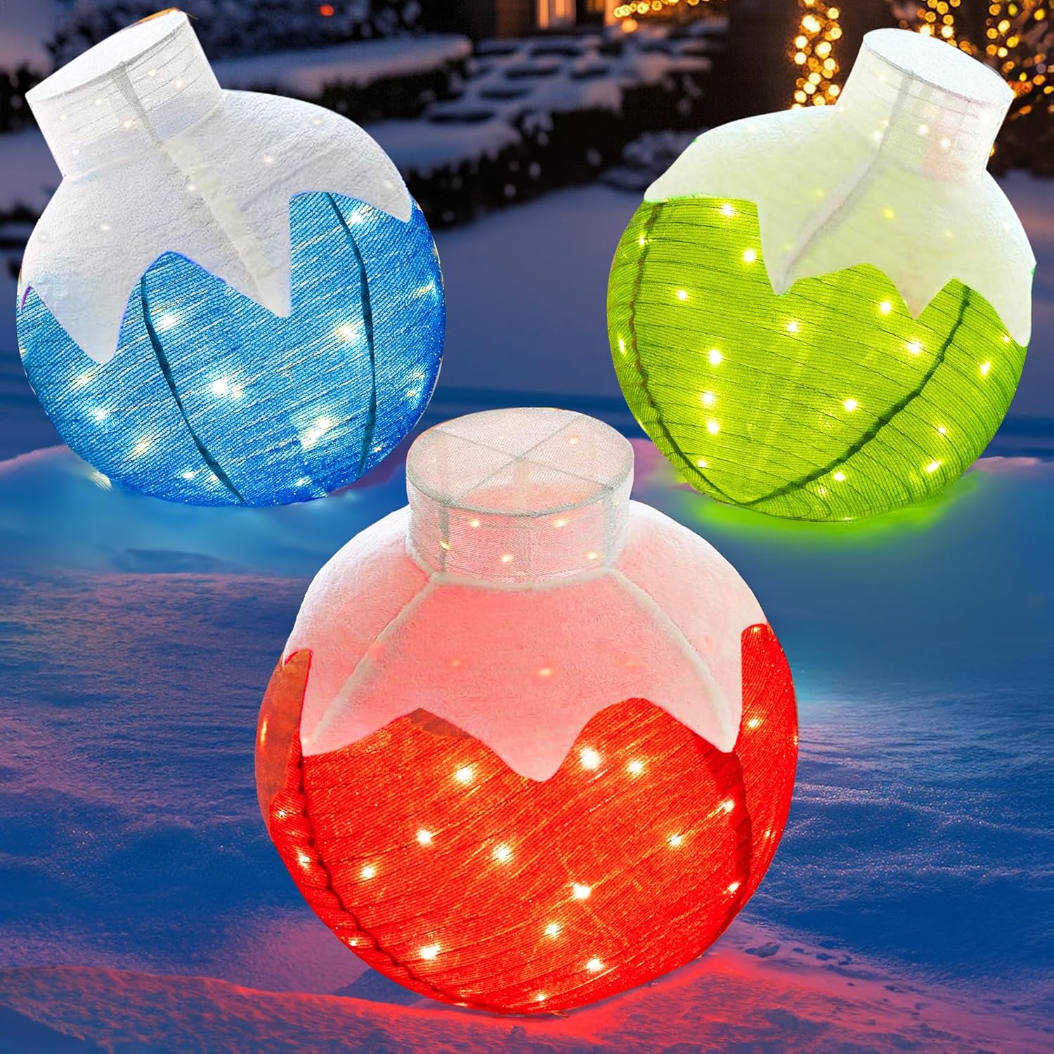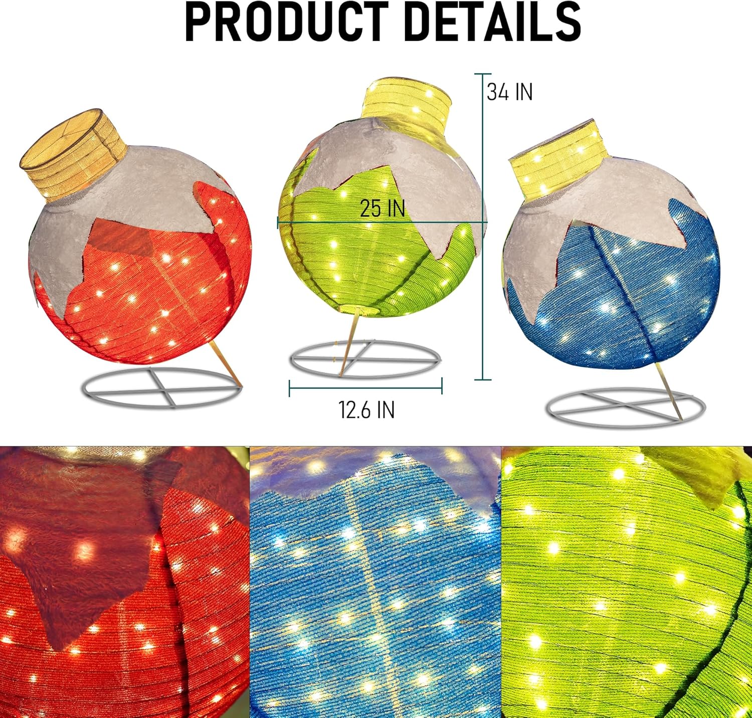Charming and Festive Design: This set includes three delightful decorative balls in green, red, and blue, all adorned with warm white lights. Each eye-catching ornament is illuminated with 90 built-in lights, and the dimensions of the illuminated Christmas balls are 25 (W) x 25 (D) x 34 (H).