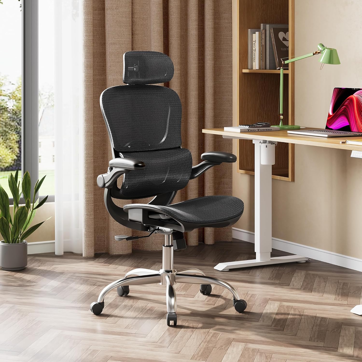 DEVAISE Ergonomic Mesh Home Office Desk Chair with Lumbar Support, High Back Reclining Computer Gaming Chair with Flip-up Armrests, 3D Headrest, Tilt Lock, Heavy Duty, SGS Class 4 Gas Lift, Black