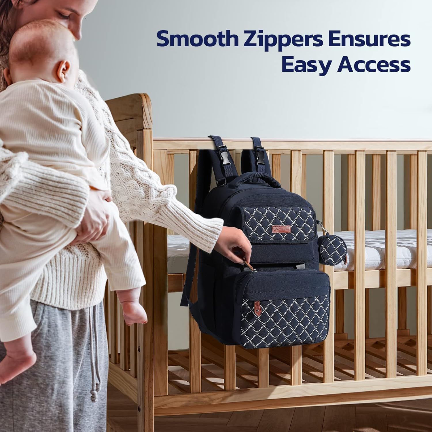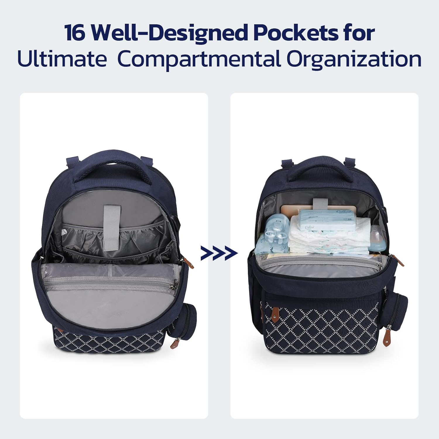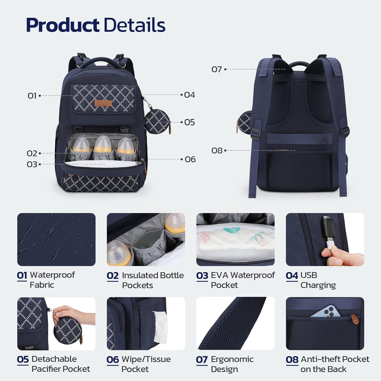 Designed for Convenience:extra-wide opening makes this diaper backpack easy to find essentials in a pinch. Dual zippers make it easy to access and close even with one hand, a built-in USB charging port provides on-the-go phone access, and a security pocket on the back is designed for cell phones, keys and cards