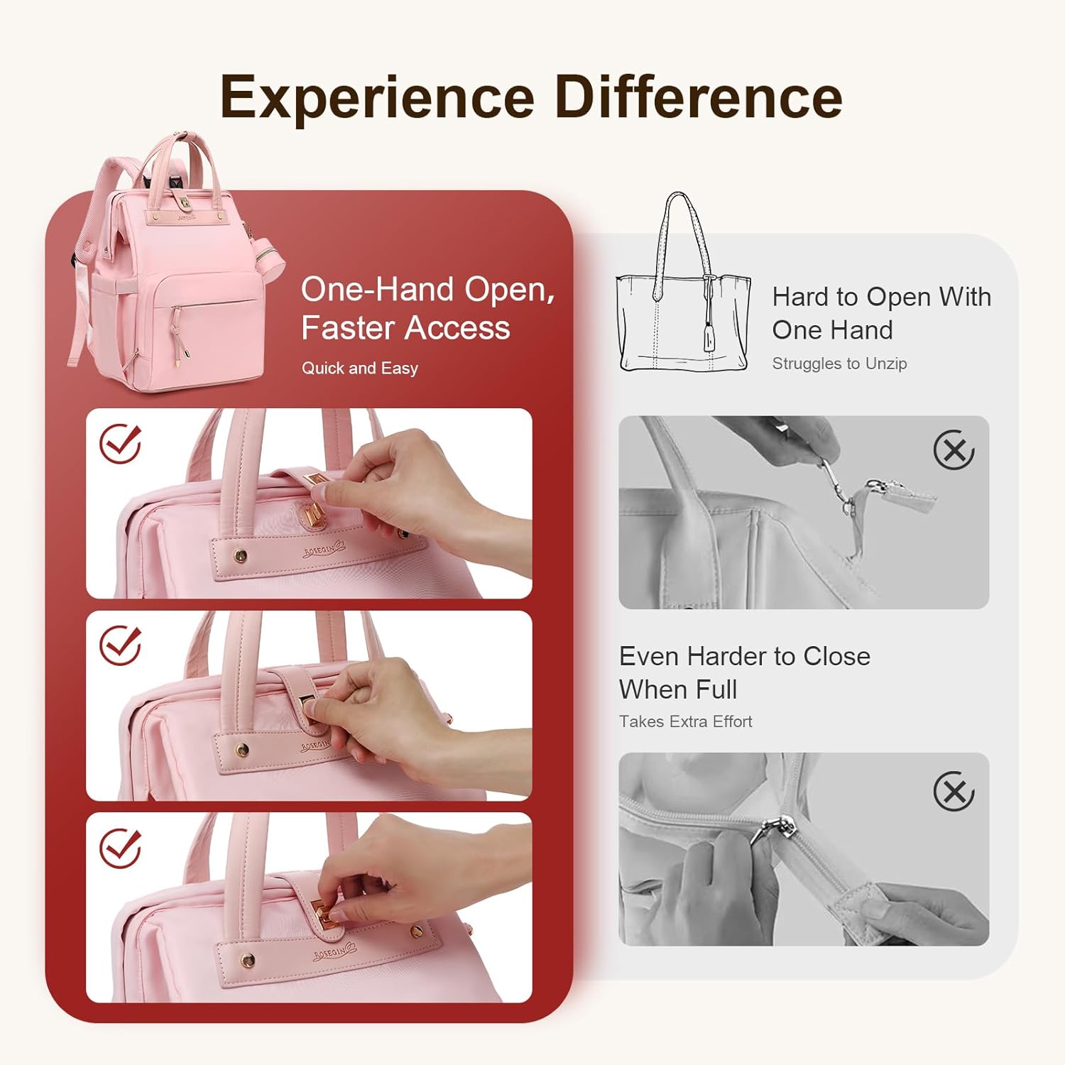 EFFORTLESS ONE-HANDED ACCESS: This medium-sized ROSEGIN diaper bag (15.35″ x 7.87″ x 12.6″, 25L capacity) features a unique one-handed opening mechanism, allowing you to quickly grab essentials even while holding your baby. Its ideal size is perfect for busy parents, ensuring that everything you need is always within reach, making outings and daily tasks smoother and stress-free.