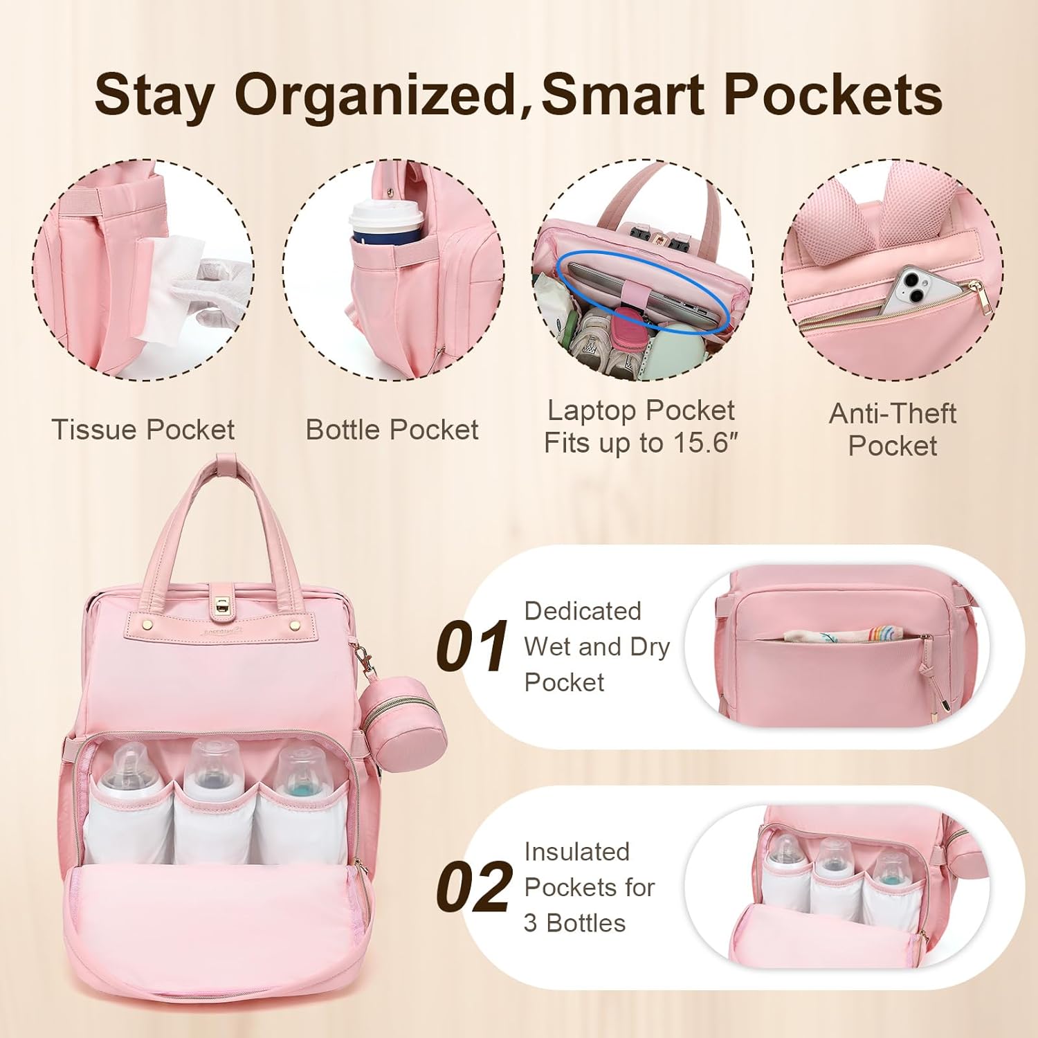 Diaper Bag Backpack with Changing Pad & Pacifier Case – One-Handed Convenience, Fits 15.6″ Laptop, Cute Baby Bag for Girls & Boys, Perfect Baby Shower for Mom & Dad, Pink