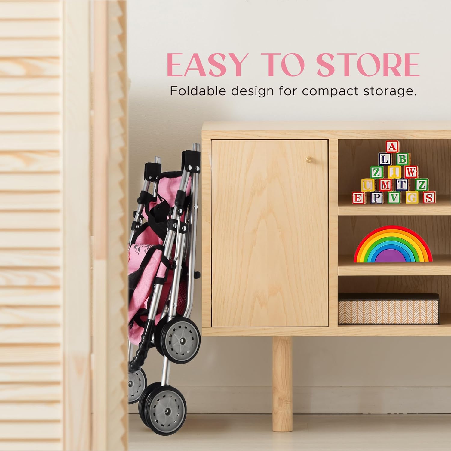 Dolls To Play’s Baby Doll Stroller: Features a foldable frame for compact storage and portability; a trusted brand offering high quality lifelike toys that spark joyful playtime for your growing kids; a great gift for birthdays or any occasion