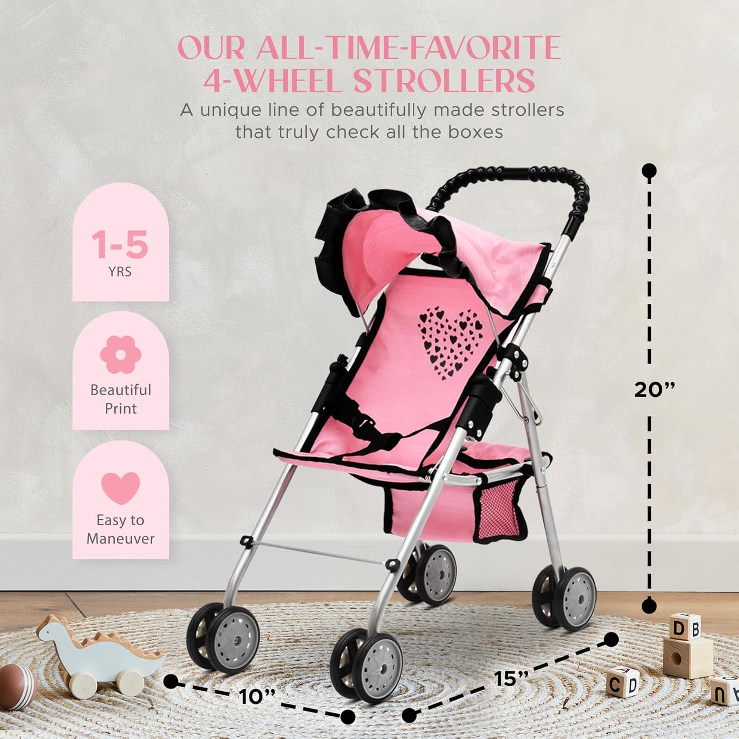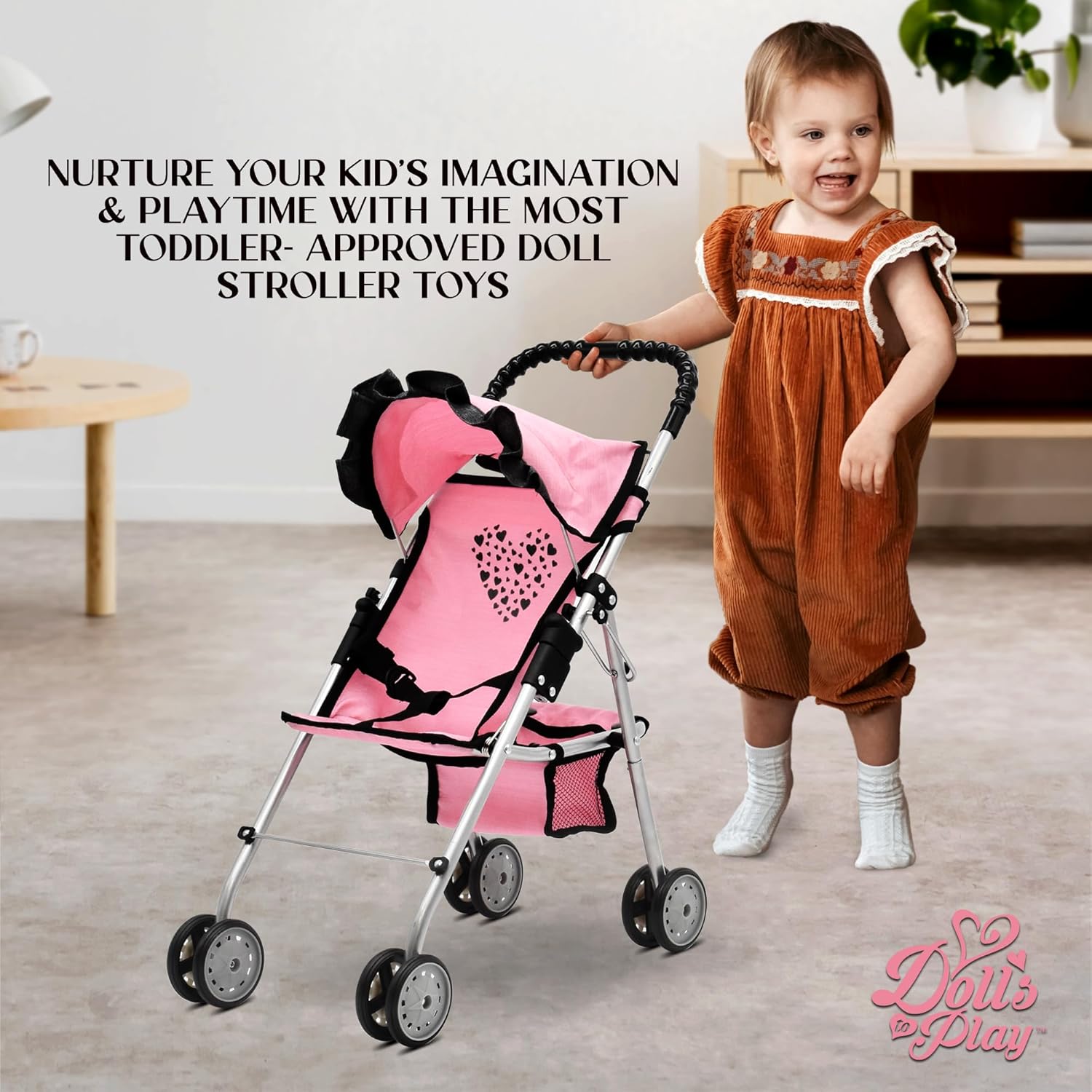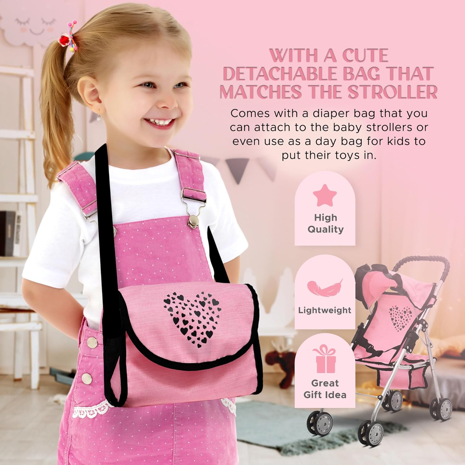 Dolls To Play Baby Doll Stroller for Girls, Toddler Play Toy Buggy Carriage Foldable with Canopy Storage Basket Travel Diaper Bag – Heart Design