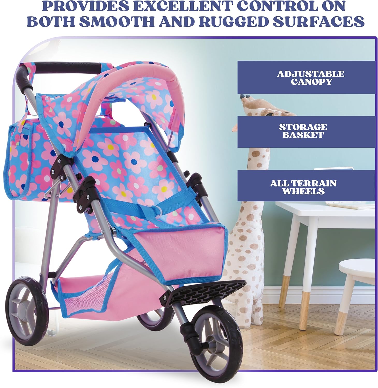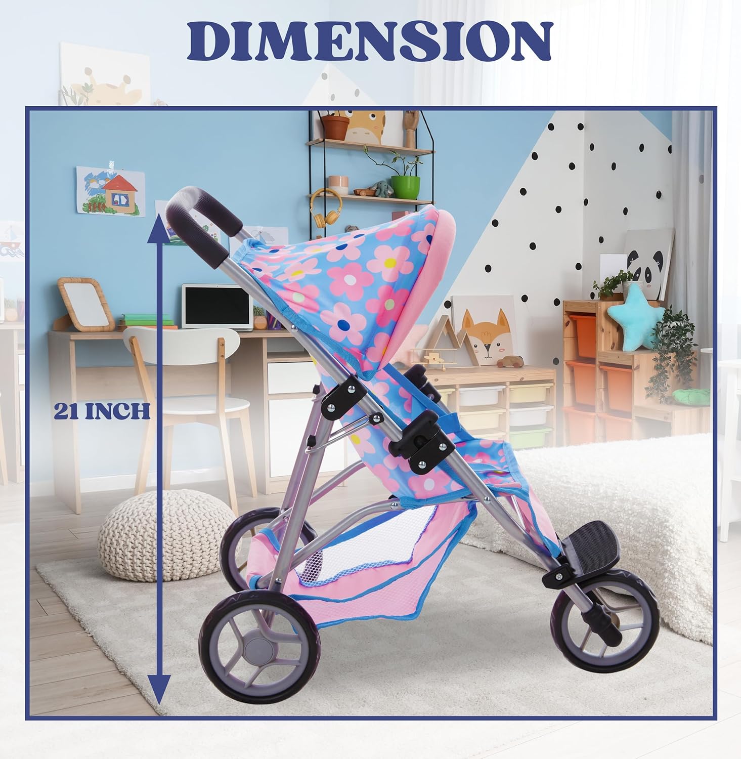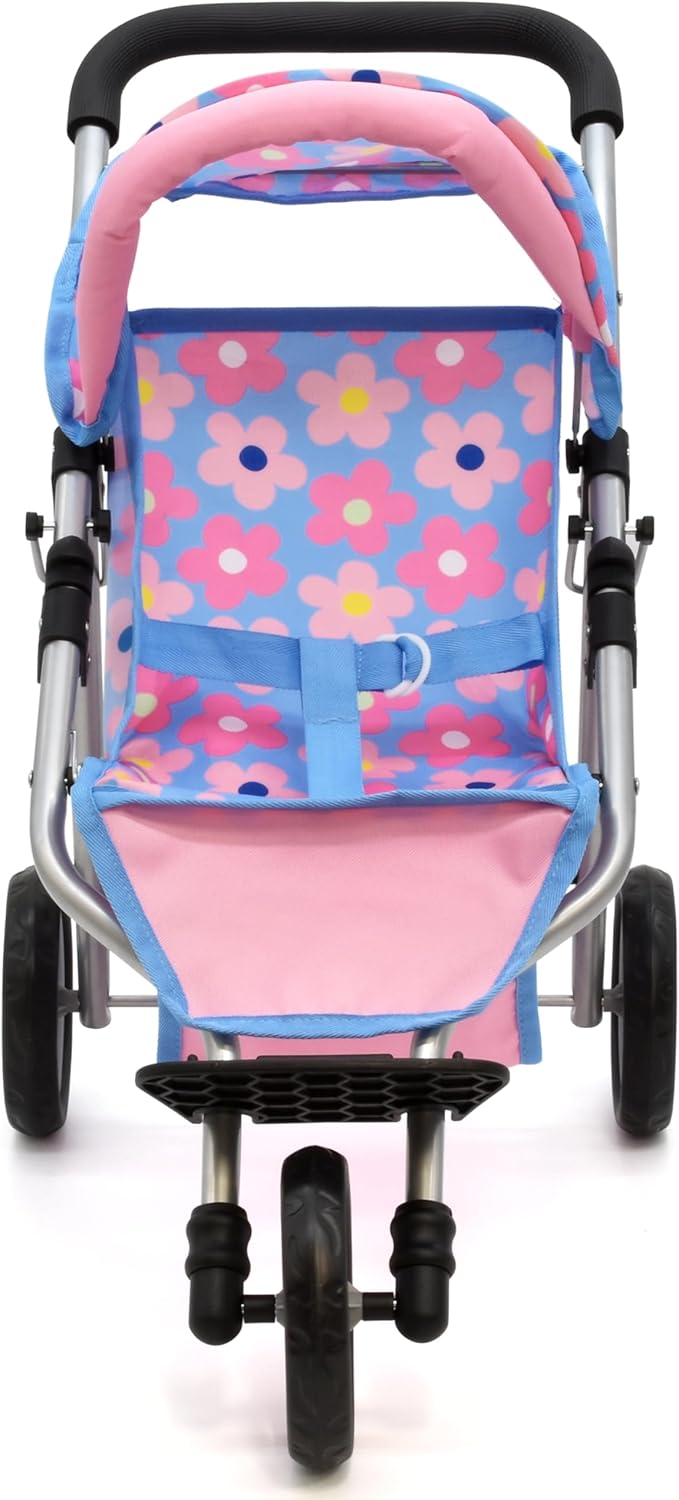 Jogger Style Baby Doll Stroller: Our 3 wheel jogging stroller features a 21 inch frame with adjustable canopy and spacious storage basket; designed for smooth maneuverability on any surface; fits 12 to 18″ dolls ideal for kids’ imaginative adventures on various terrains