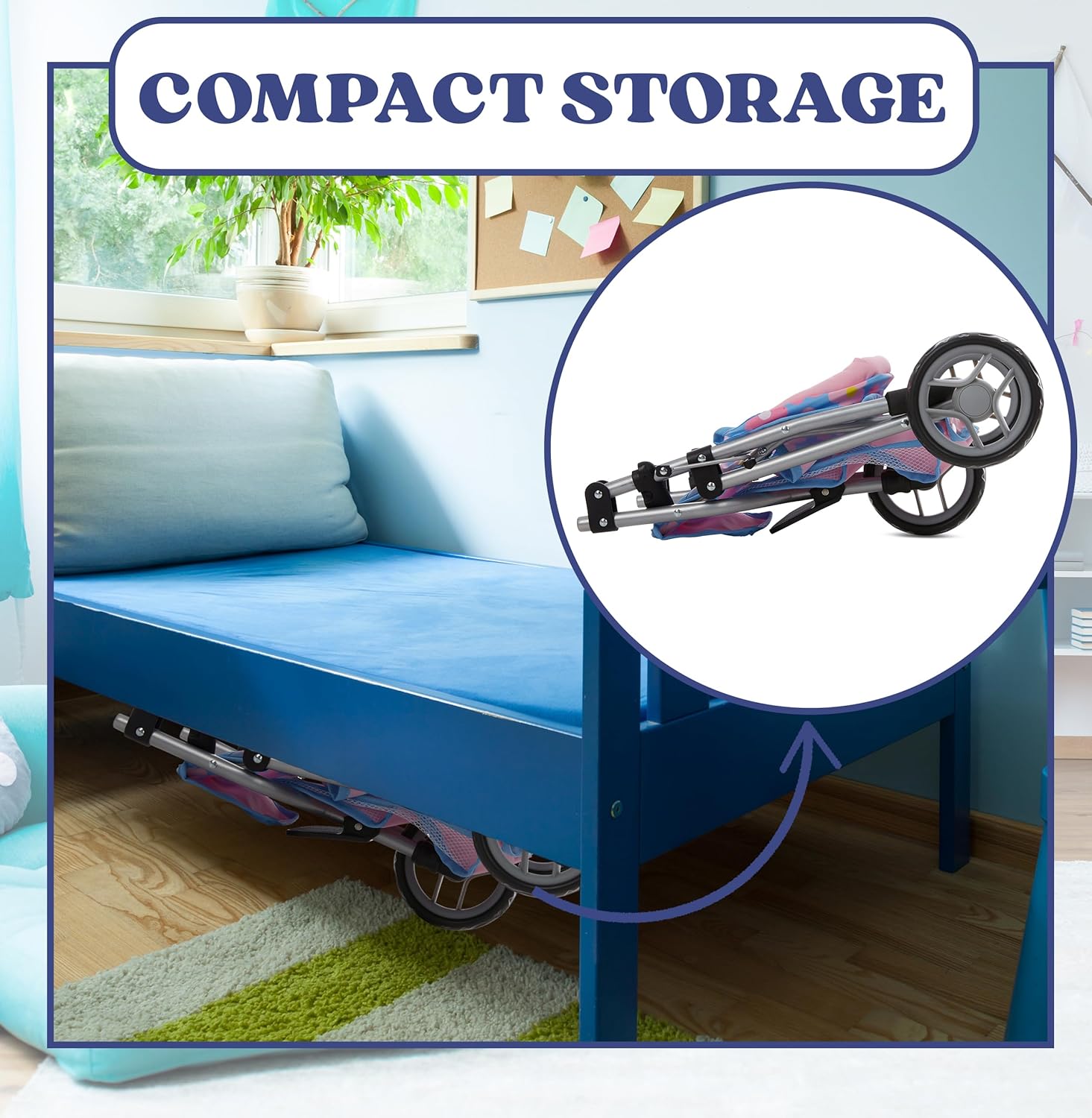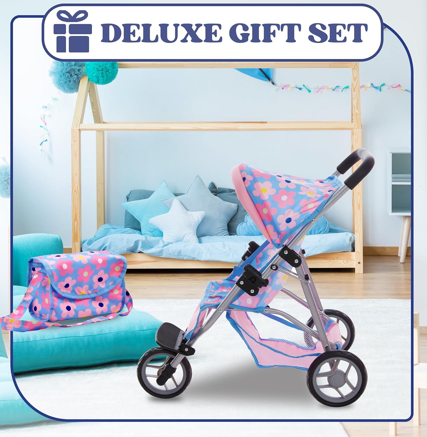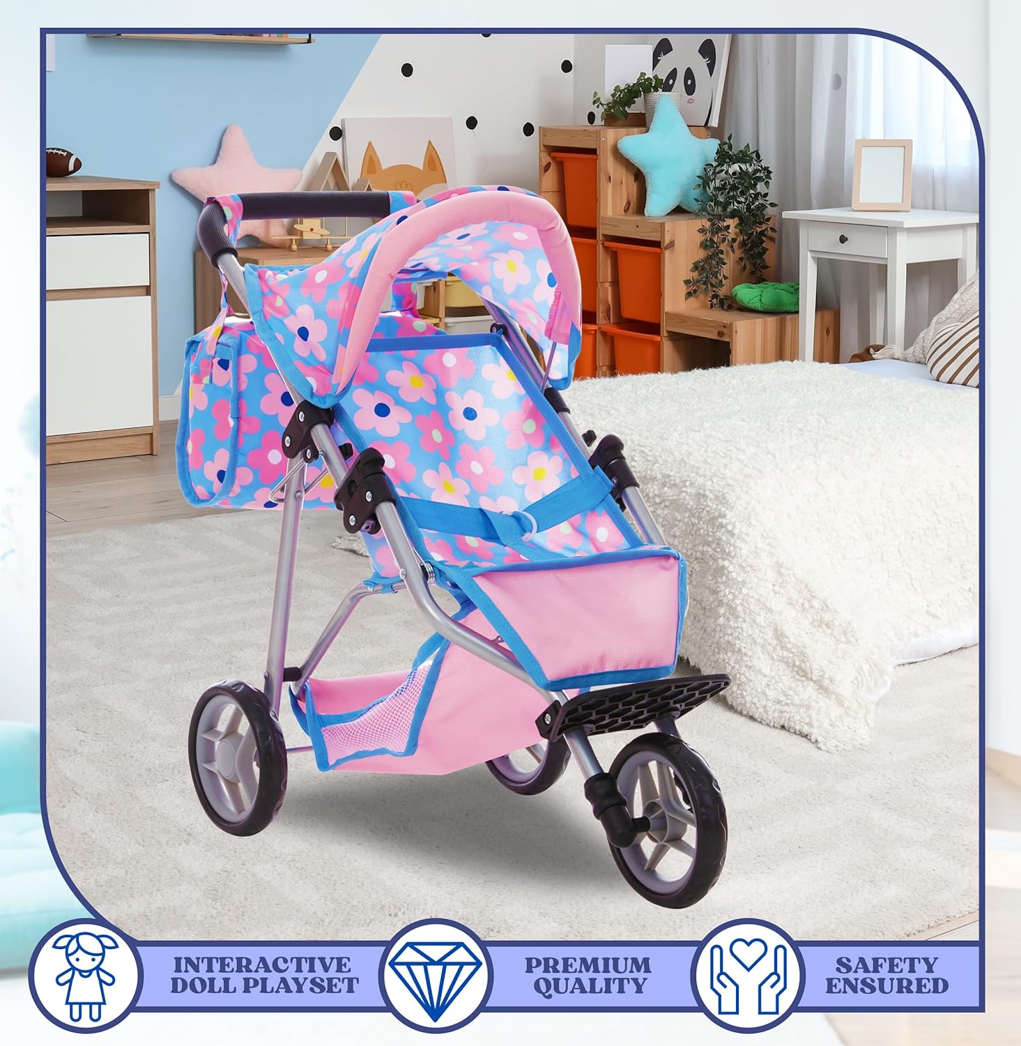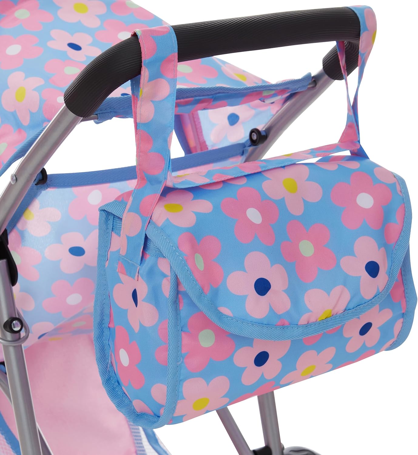 Matching Blue Bag & Storage Basket: Our jogging stroller comes with convenient storage basket and matching vibrant colorful diaper bag to keep doll accessories organized and accessible; adds a more fun realistic touch to this adorable doll stroller