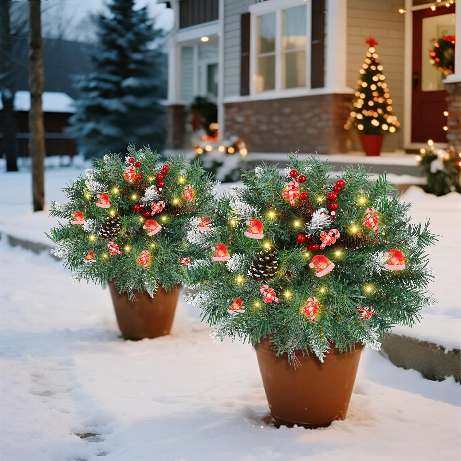 Whether enhancing your outdoor Christmas pot filler or gracing your front stairway, this piece serves as both a striking outdoor winter decoration and a versatile holiday planter with lights.
