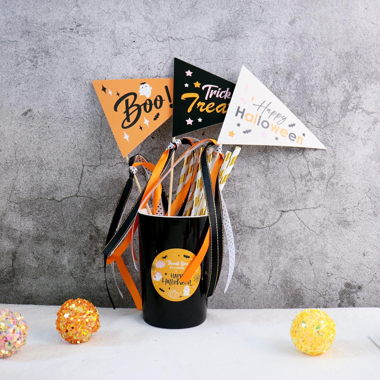 Package: Pack of 6pcs Halloween triangle flags,come with 6pcs 16inch halloween ribbon string, you can diy any style you like!