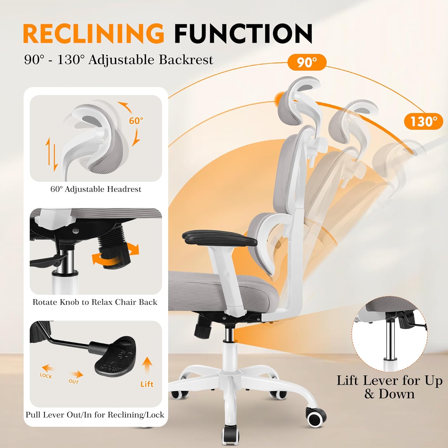 𝗘𝗮𝘀𝘆 𝗔𝗱𝗷𝘂𝘀𝘁𝗺𝗲𝗻𝘁 & 𝗖𝘂𝘀𝘁𝗼𝗺𝗶𝘇𝗮𝘁𝗶𝗼𝗻:This reclining office chair offers simple one-lever control: lift to adjust seat height and pull to recline with three locking positions. The 3D armrests can be adjusted in height, width, and angle. An expanded headrest follows the natural curve of your neck and supports up and down adjustment plus 60 degrees of rotation.
