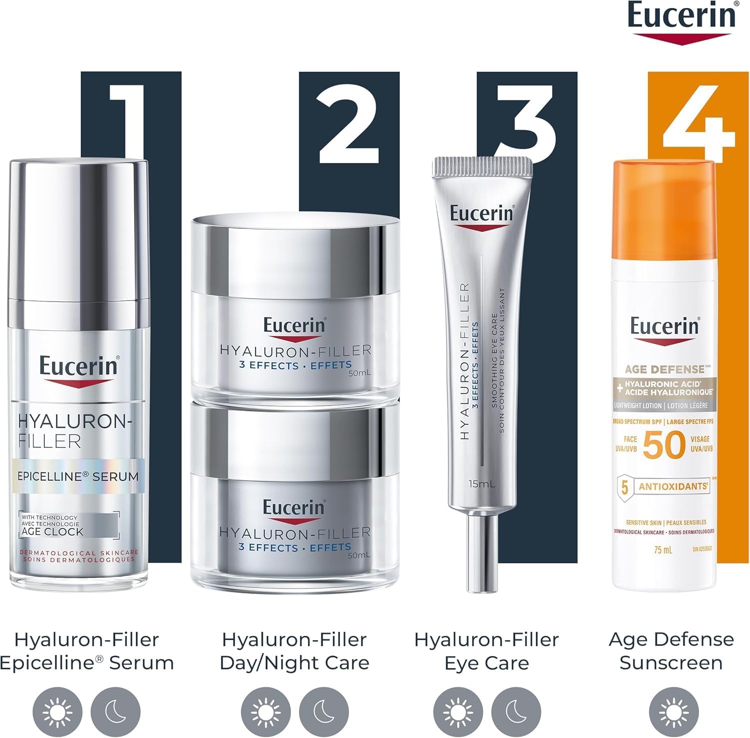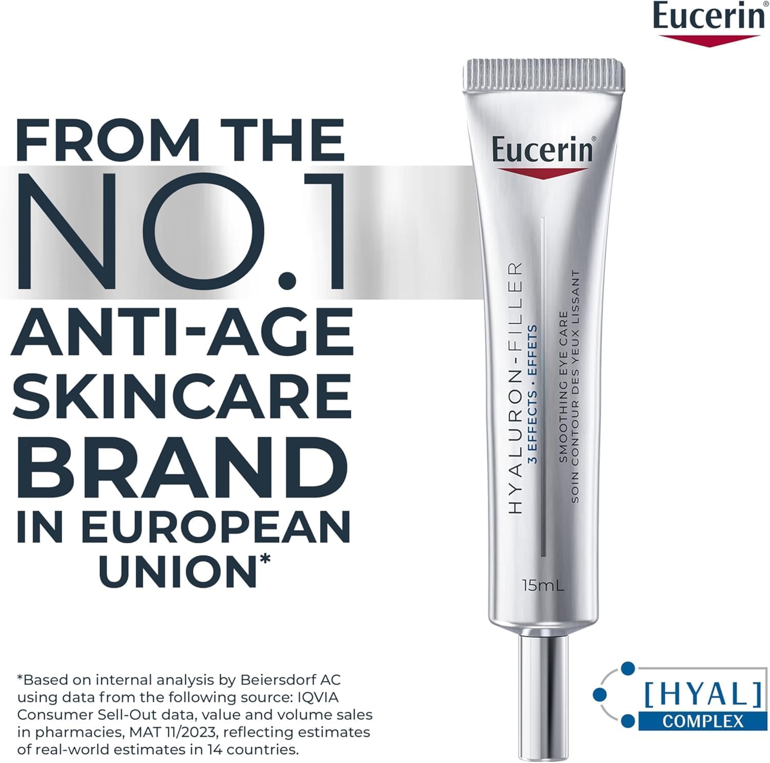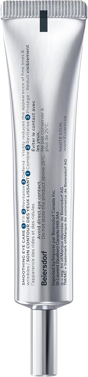 Eucerin Anti Wrinkle Smoothing Eye Care cream targets signs of aging with a three-effects formula that reduces the signs of aging for visibly younger-looking, smoother and radiant skin. As we age, the skin’s natural ability to produce hyaluronic acid decreases, causing fine lines and wrinkles to form. Formulated with high and low molecular hyaluronic acid, this firming eye cream enhances moisture retention, while penetrating to re-plump the look of eye wrinkles and reduce the look of puffiness in the eye area. This anti aging eye cream also replenishes the skin’s own hyaluronic acid for a revitalized look and defends the skin against environmental stressors. Ideal for all skin types, this under eye cream for women is non-comedogenic, dermatologically tested and ophthalmologically tested. It’s also fragrance-free and suitable for use with contact lenses. Apply this anti aging eye cream to the eye area as a part of your morning face care routine, avoiding direct eye contact. For the best results, pair this eye moisturizer with other Hyaluron-Filler skin care products, like Epicelline Serum, Firming Day Care and Regenerating Night Care.