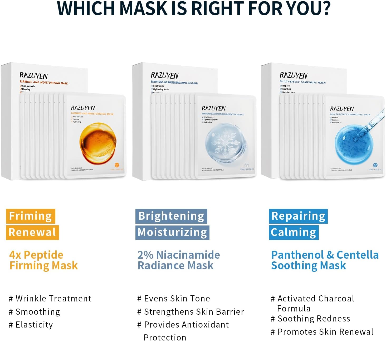 HYDRATE & MOISTURIZE: The hyaluronic acid and sodium hyaluronate in RAZUYEN sheet masks are more moisturizing and can deeply hydrate the skin and lock in moisture, Leaves your skin hydrated and let your beauty shine!