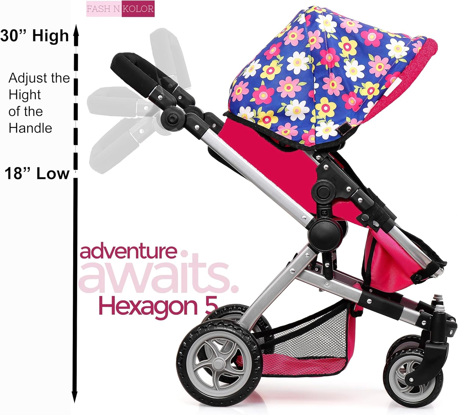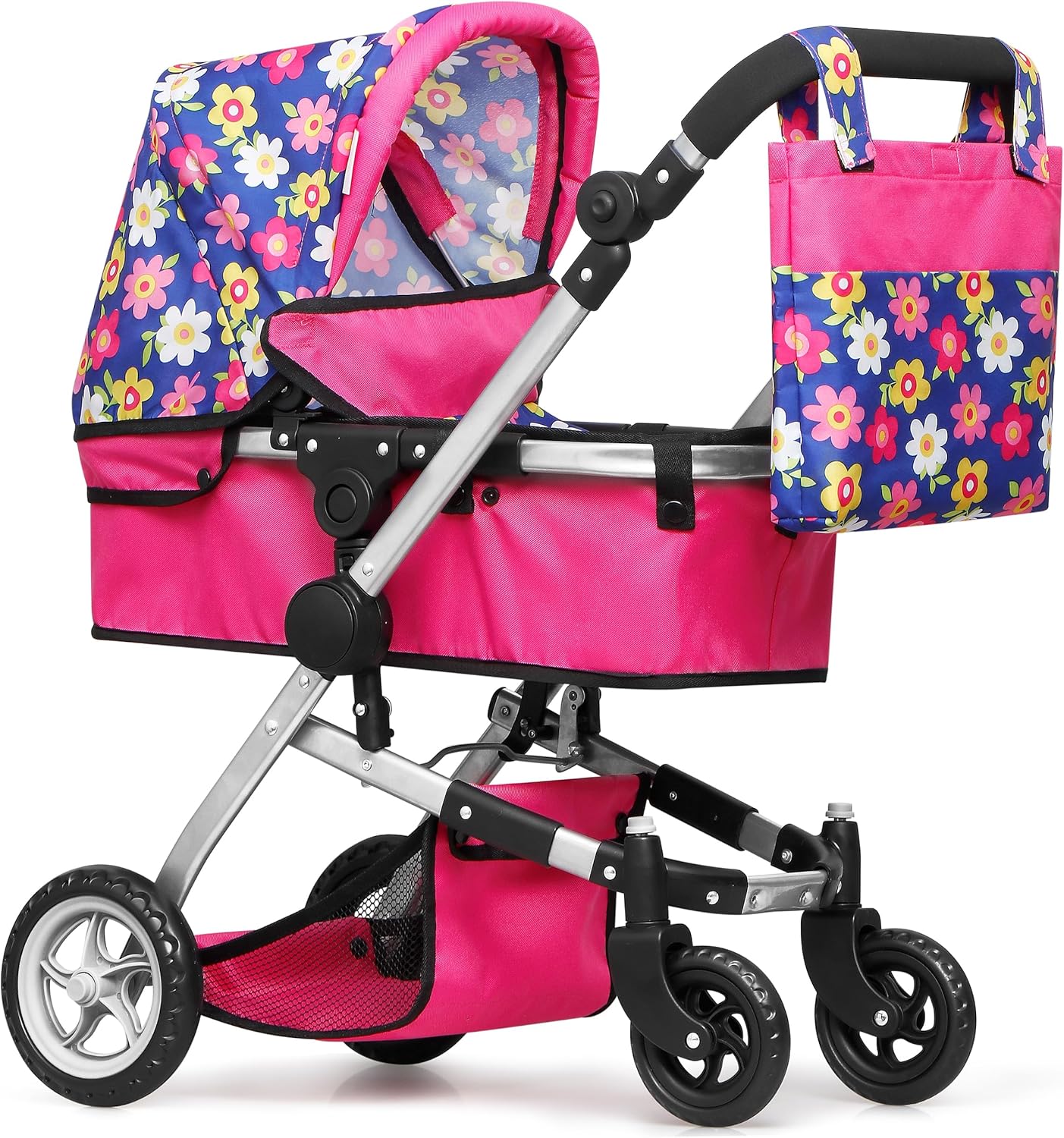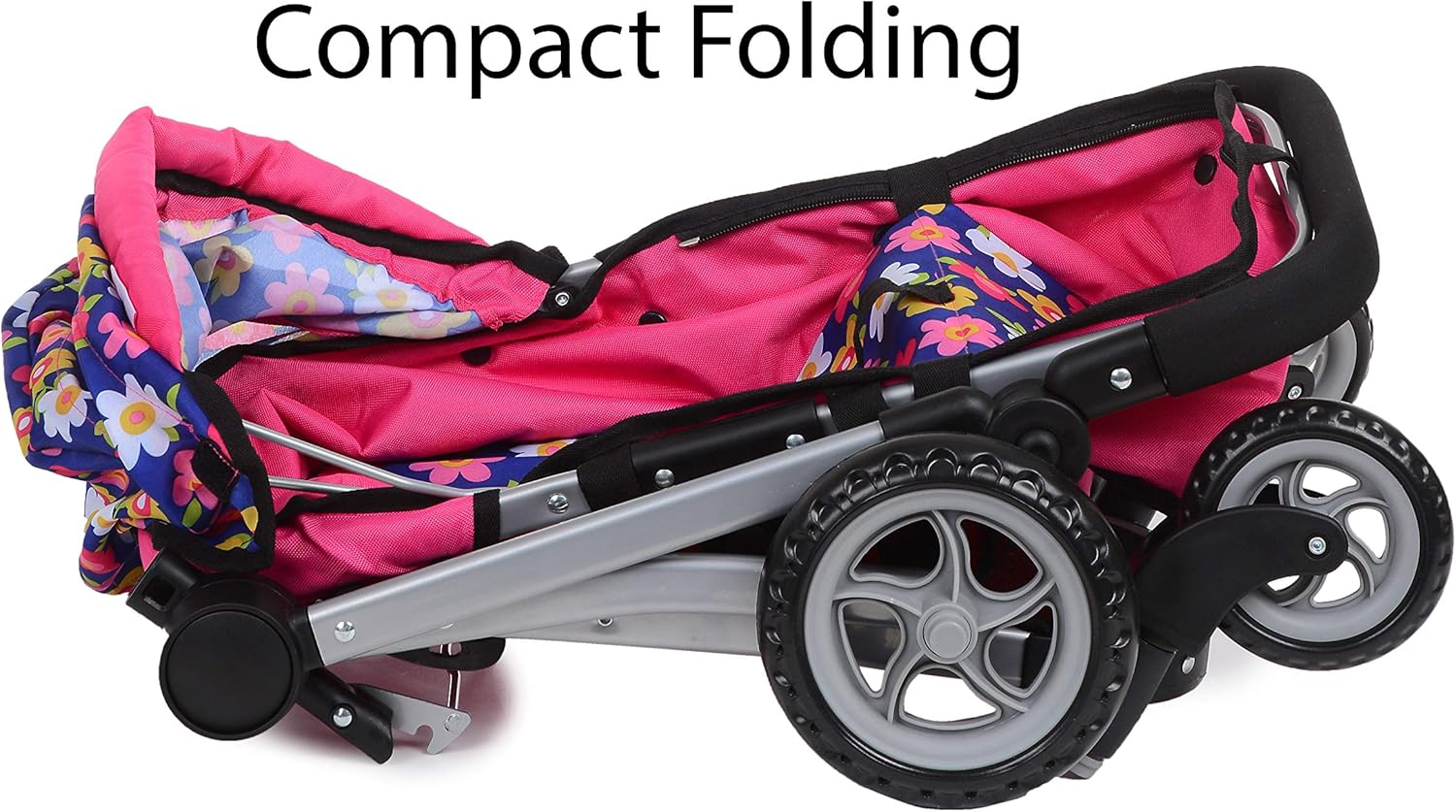 Fash N Kolor | Foldable Pram for Baby Doll with Flower Design with Swiveling Wheel Adjustable Handle Bassinet Stroller with Baby Doll, Convertible Seat, and Basket, and Free Carriage Bag