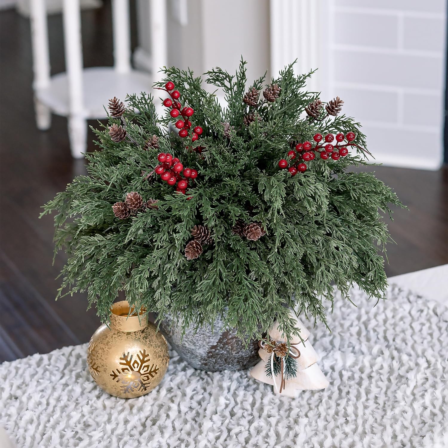 12 PCS faux cedar stems3 PCS red berry stems2 PCS pine cones stems