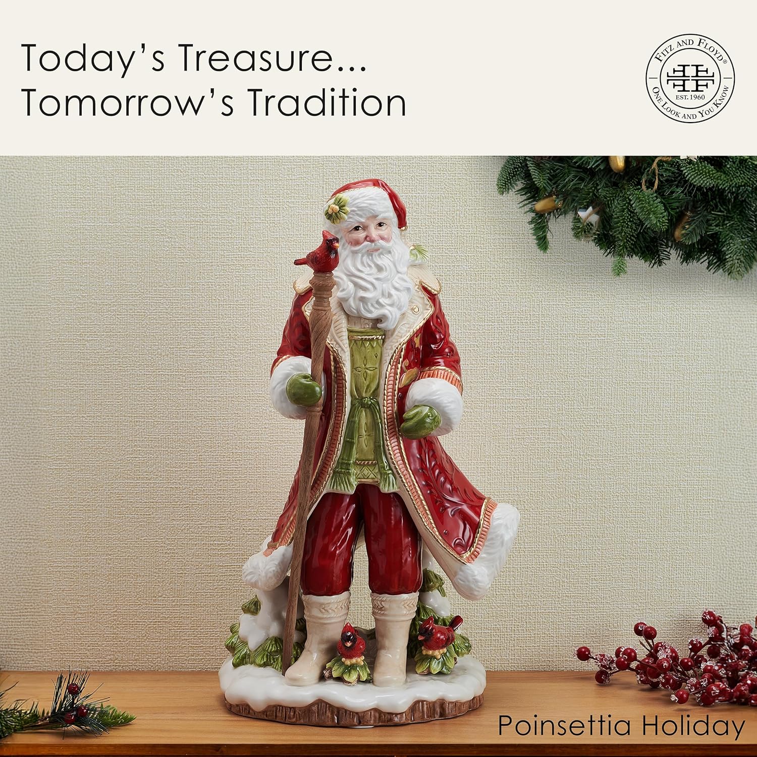 Fitz and Floyd Poinsettia Holiday Santa Clause with Staff Cardinal Bird Ceramic Figurine, Christmas Collectible Décor, 17.5 Inch