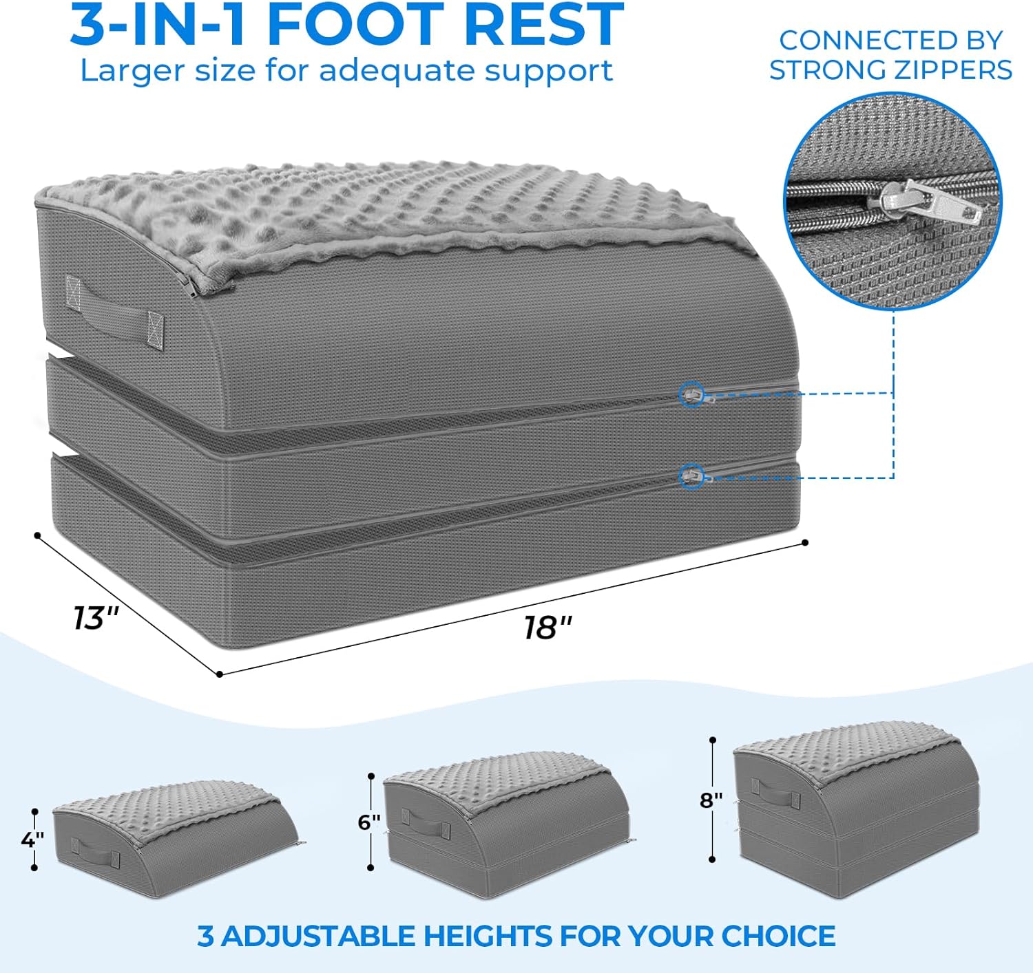 3-IN-1 Under Desk Footrest: Measures 18″ x13″(L x W), KingPavonini desk foot rest has a larger size than other footstools and 3 adjustable heights(4″, 6″and 8″), ensuring enough space for your feet, and allowing you to adjust it to a comfortable height to provide right support for your legs, helping relieve pressure on your lower back and legs and reducing feet swelling. The zippers connection makes the footstool more stable and durable, avoiding looseness and shaking.