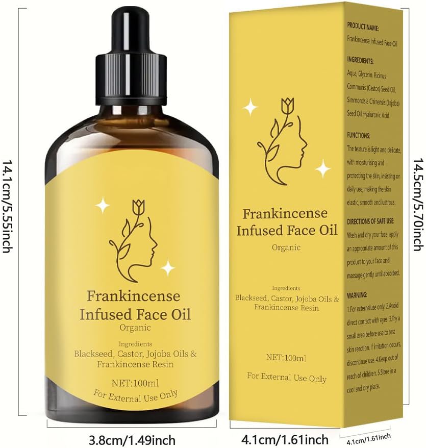 Pure Organic Ingredients, Safe for Sensitive Skin: Crafted with certified organic oils, our Frankincense Face Oil is free from parabens, synthetic fragrances, and harmful chemicals. This clean, toxin-free formulation ensures gentle care for even the most sensitive skin, giving you peace of mind while enhancing your natural beauty.