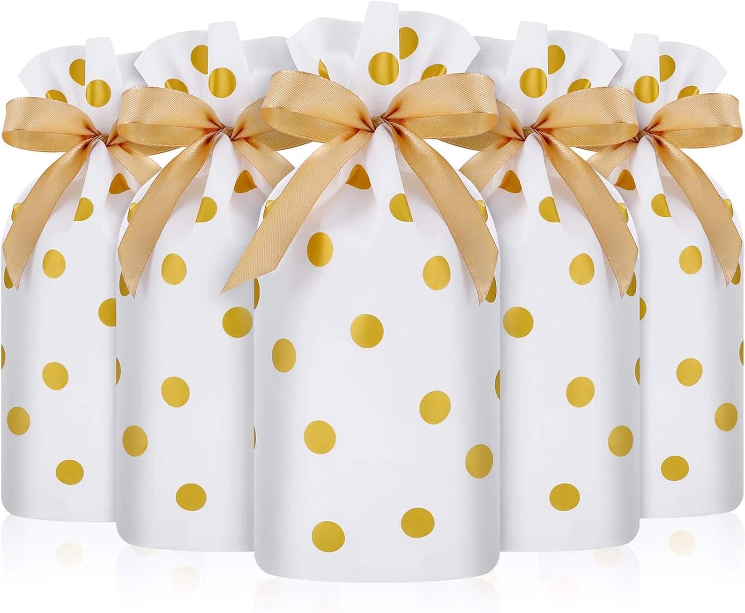 Convenient and Elegant Design: the equipped ribbon drawstring closure design helps you store things quickly and packing and disassembly easily; Gold polka dot print bags make your gifts look more delicate and elegant in party favors