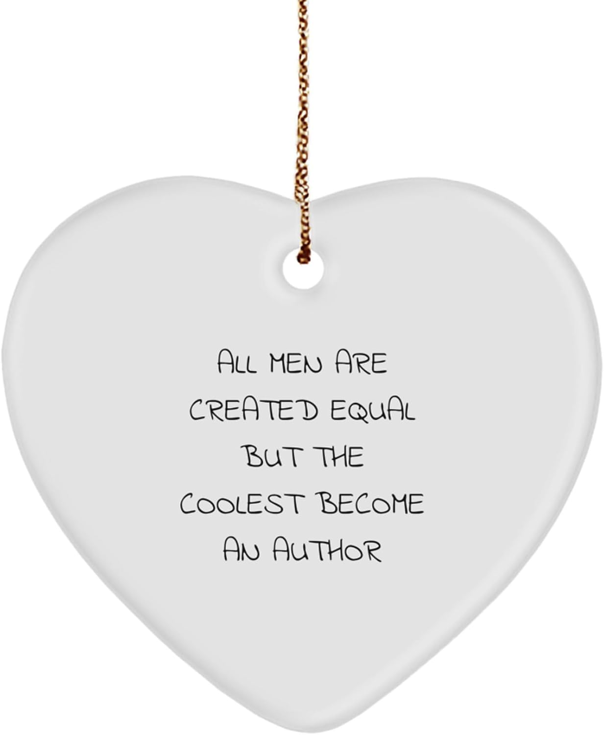 Make a thoughtful gift for the author in your life with our Funny Author Heart Ornament, featuring the humorous quote ‘All Men Are Created Equal But The Coolest Become An Author’. This unique gift is perfect for author lovers and bookworms alike, and is sure to bring a smile to their face. The heart-shaped design is crafted from sturdy MDF with a high-gloss plastic finish, making it a long-lasting and vibrant addition to any room.