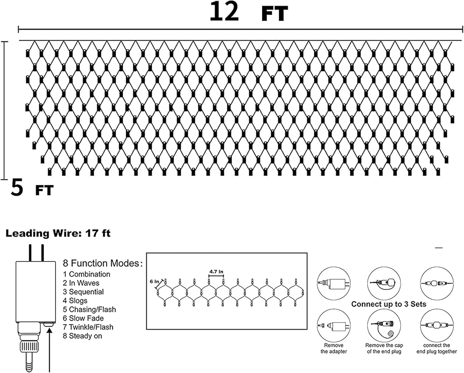 Transparent Wire Christmas Net Lights: The lights size is 12ft x 5ft, with 16.5ft lead cable. Compare with other green or black wire, transparent wire natural integrate with tree and bushes. Male and female safety plugs can be connected to no more than 4 strings of lights. Allow you to decorate your lighting space with the required length.