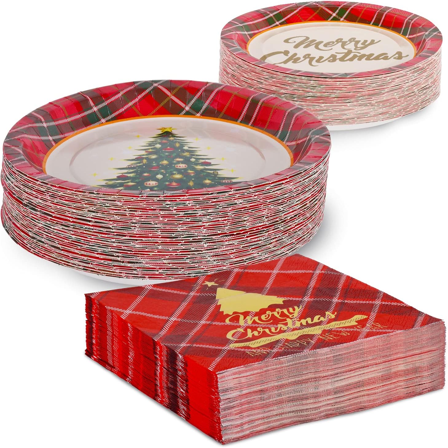 Gatherfun Christmas Party Supplies Christmas Tree Red Plaid Disposable Paper Dinner Plates Dessert Plates and Napkins for Party decorations, Serve 50