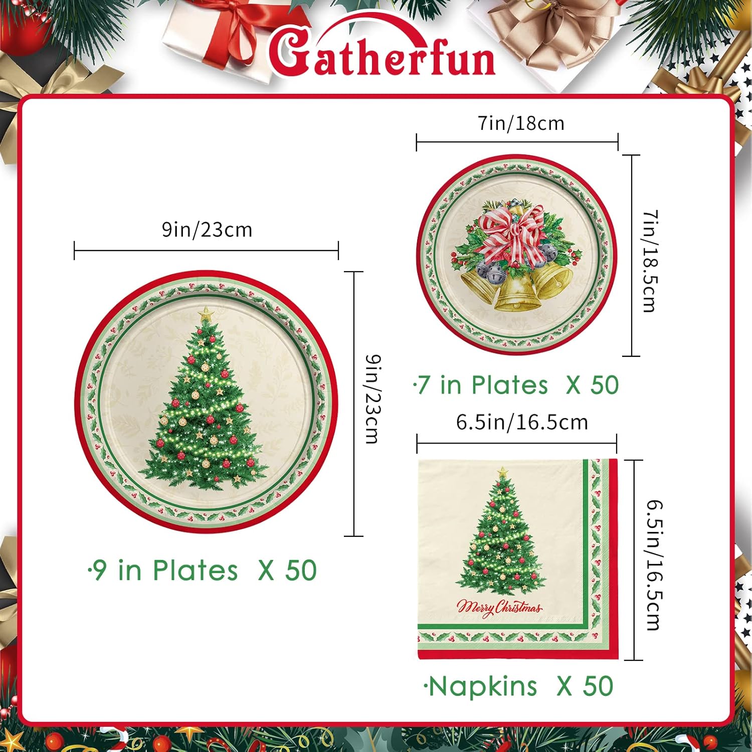 Christmas Tree PACKAGE INCLUDES: 50 pcs 9 inch paper dinner plate, 50 pcs 7 inch paper dessert plates, and 50 pcs Christmas Tree paper napkins (3ply, 6.5”x 6.5”folded)