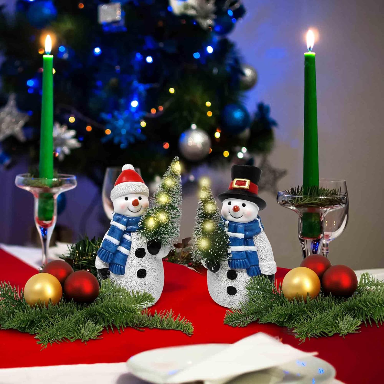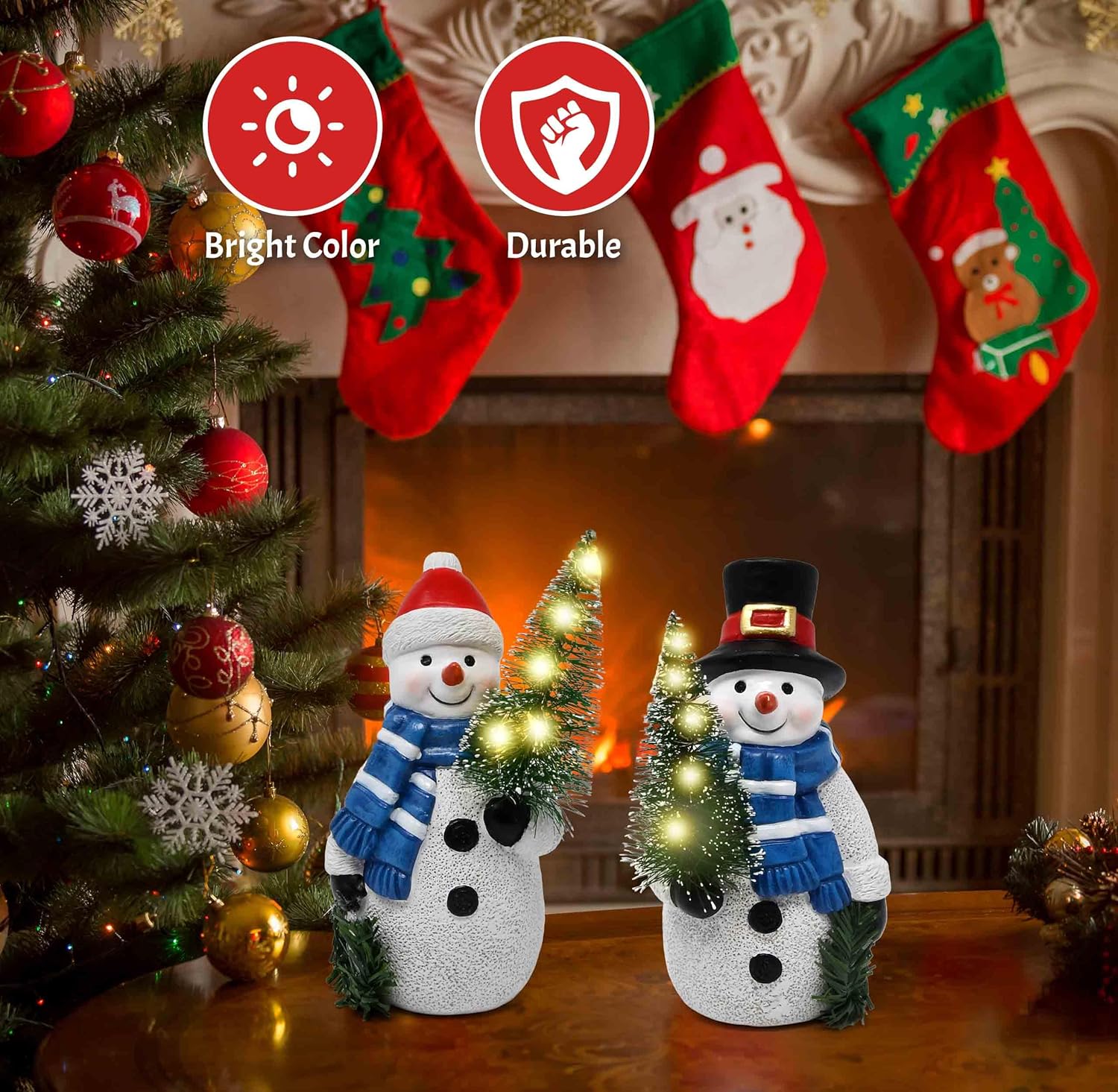 Charming Snowman Design: Features snowman figurines with friendly expressions; blue & white scarves; one with a red Santa hat & the other a black top hat; includes wreaths & led light up mini trees for cute holiday decor that adds a warm festive glow
