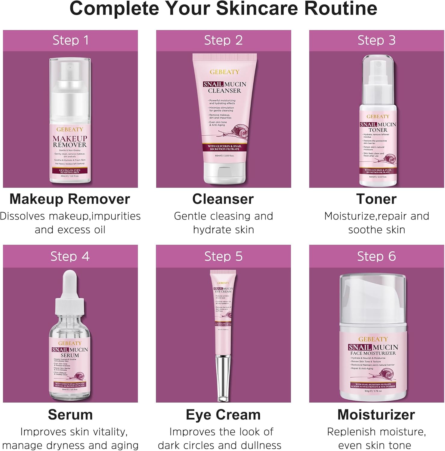 The GEBEATY snail mucin Hydration Kit contains all of your skincare favourites in a TSA-ready travel-sized kit. The kit includes Makeup Remover, Cleanser, Moisturizer, Serum, Toner, and Eye Cream for a radiant, youthful look.