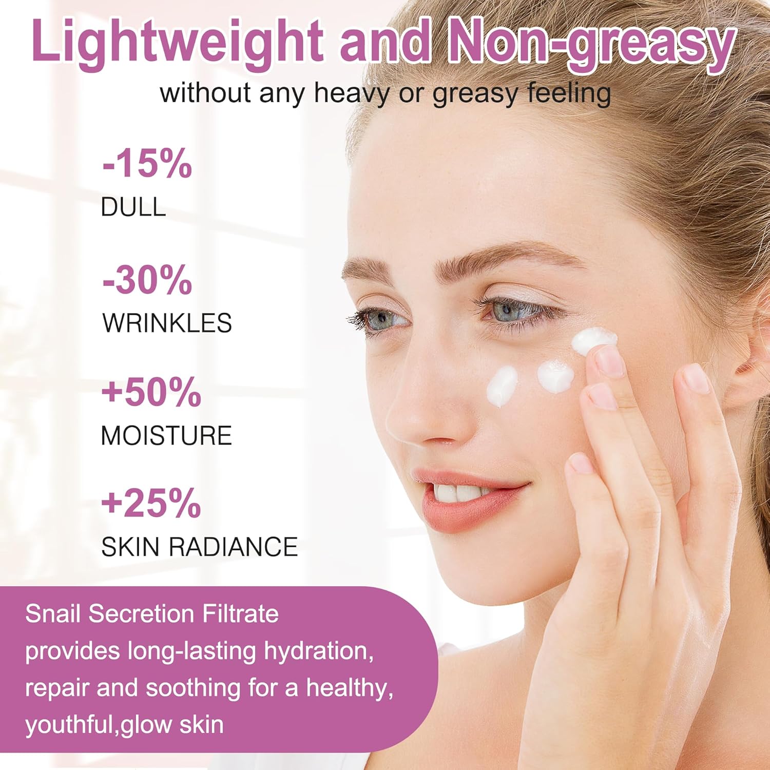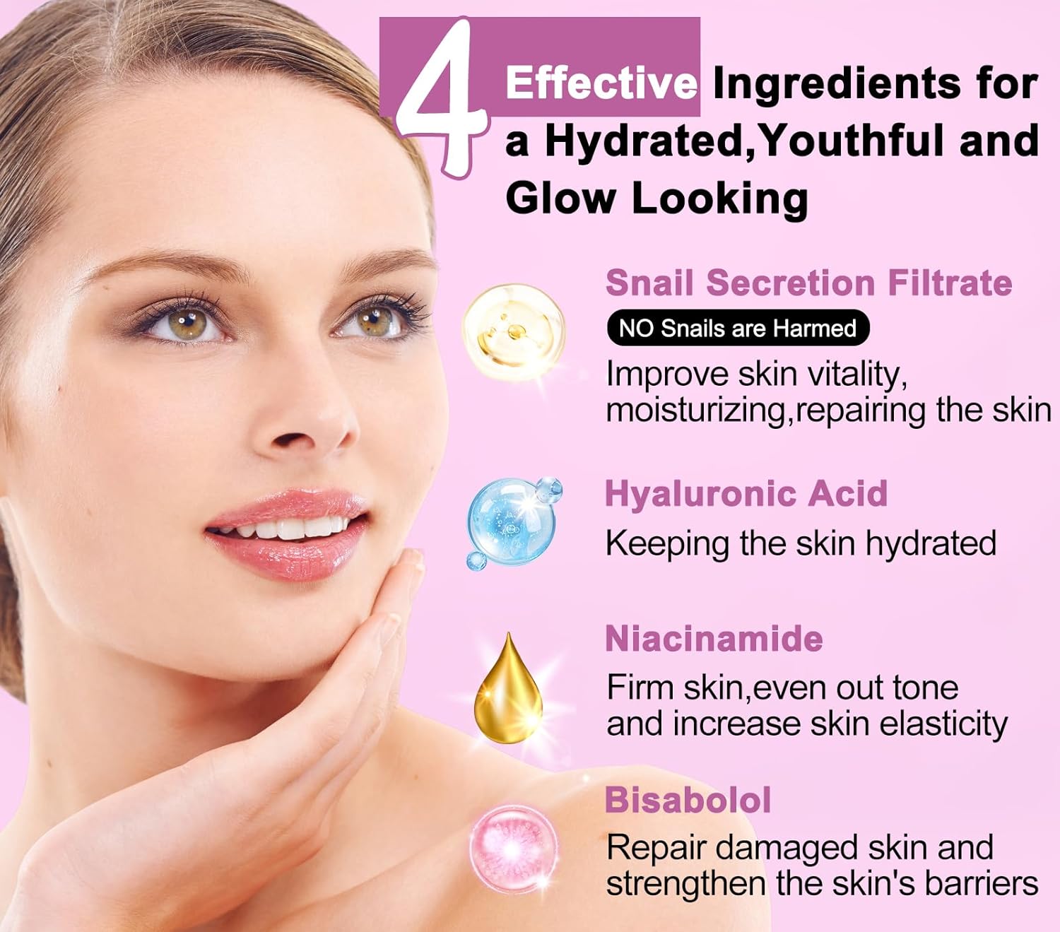Lightweight and Non-greasy: Our facial skin care products absorb quickly to get long-lasting hydration,repair and soothing skin.Enjoy a healthy glow without any heavy or greasy feeling.Snail Mucin is obtained in a friendly way.NO Snails are Harmed