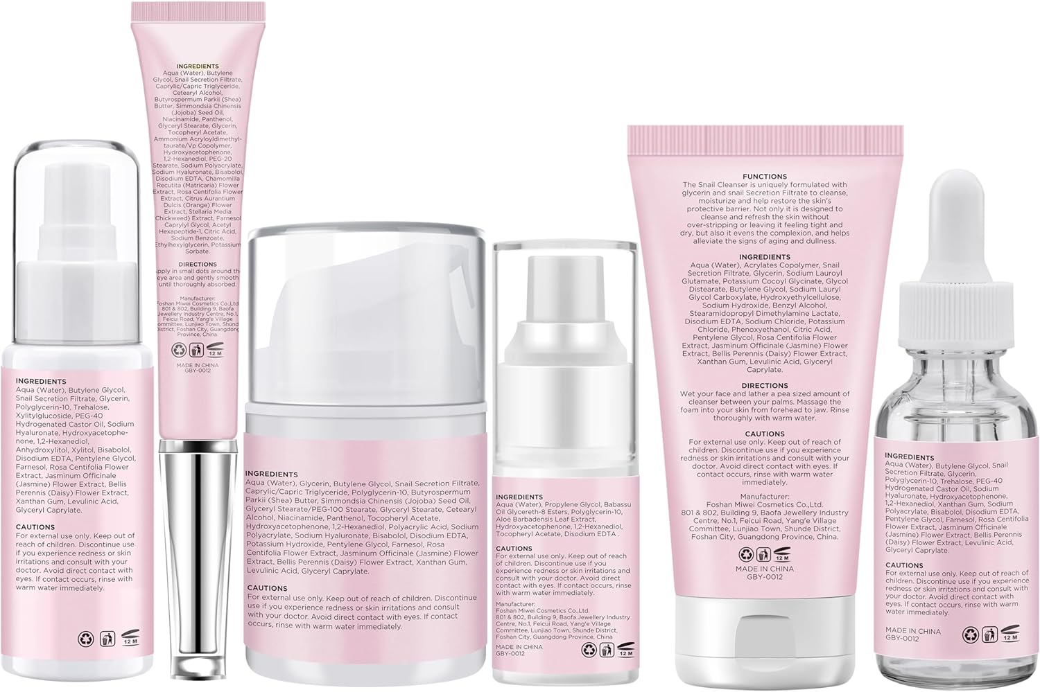 Advanced Snail Mucin Kit: Our skincare set includes everything needed for a radiant,youthful look: Makeup Remover,Cleanser,Moisturizer,Serum,Toner,Moisturizer and Eye Cream.Your complete skincare routine in one kit for repairing,moisturizing,soothing