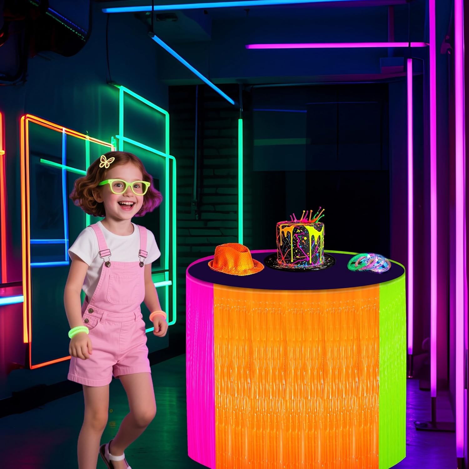 Vivid Neon Color Combo – Package includes 2 sets (6 colors total) fluorescent tinsel foil fringe table skirts. Set A contains rose red, orange & yellow, set B features green, deep blue & purple. Perfect for creating layered color effects or coordinating with party themes.