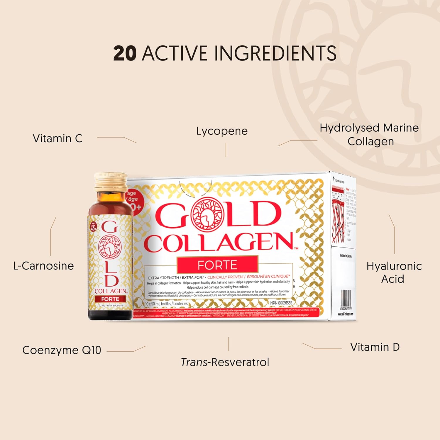 20 ACTIVE INGREDIENTS INCLUDING ESSENTIAL ANTIOXIDANTS, VITAMINS & MINERALS – Gold Collagen Forte’s unique maximum strength formulation includes hyaluronic acid and borage oil for maximum skin hydration, moisturization and cellular function; vitamin C for skin brightening; and vitamins D, E, B6 and biotin + zinc & copper for healthy skin, hair & nails. Cold Collagen Forte contains other powerful antioxidants: resveratrol, acai berry, CoQ10 and evening primrose oil to prevent oxidative stress.
