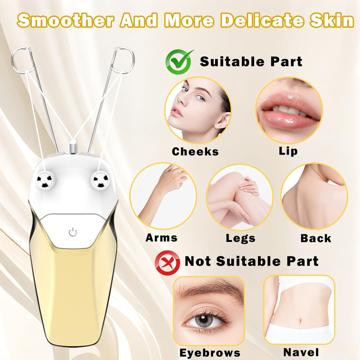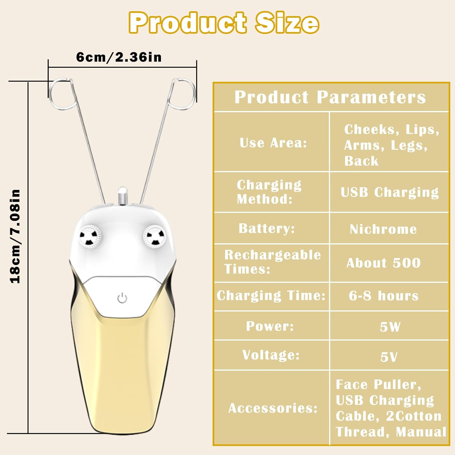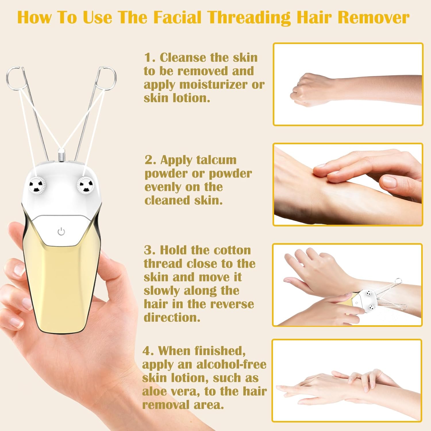 Advanced Threaded Facial Hair Removal Technology: This gold threading epilator utilizes advanced threading technology to gently and effectively remove facial hair from the root with a twisted cotton thread. Provides fast and safe facial threading hair removal. It is free of chemicals, waxes, and blades for natural, clean, non-irritating hair removal that leaves skin smooth.