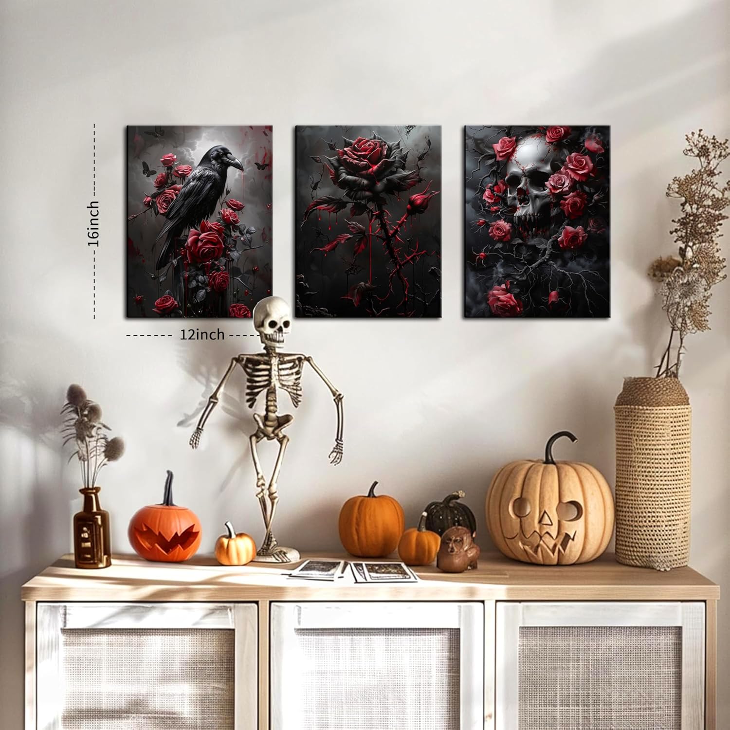 Unique Gothic Wall Art: This Gothic canvas wall art set features romantic roses, dark crows, and skull motifs, adding a touch of mystery and elegance to your home decor. Perfect for decorating bathrooms, living rooms, or creating a Halloween-themed space, these prints infuse any room with a gothic atmosphere.