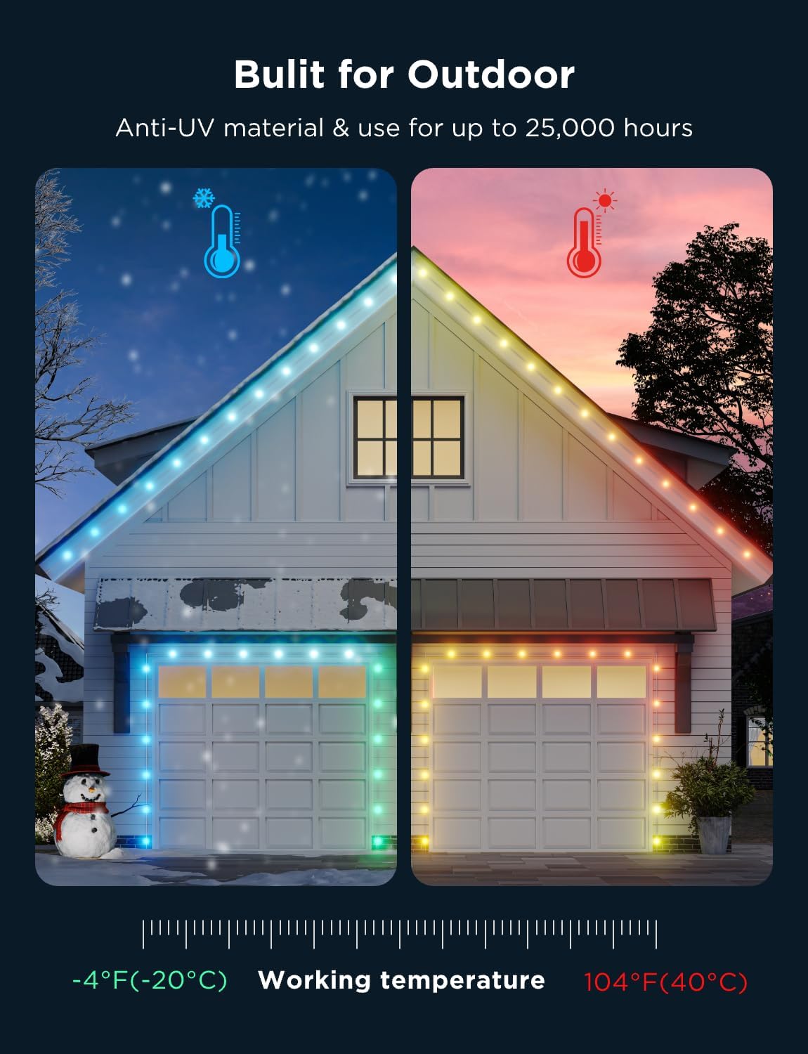 Outdoor Durability: Even in -4℉ to 104℉ cold environments, these IP65 waterproof outdoor lights can function normally. Ideal for winter, lasting up to 25,000 hours, keeping your house and garage beautiful. Control box is IP65, adapter is IP44.