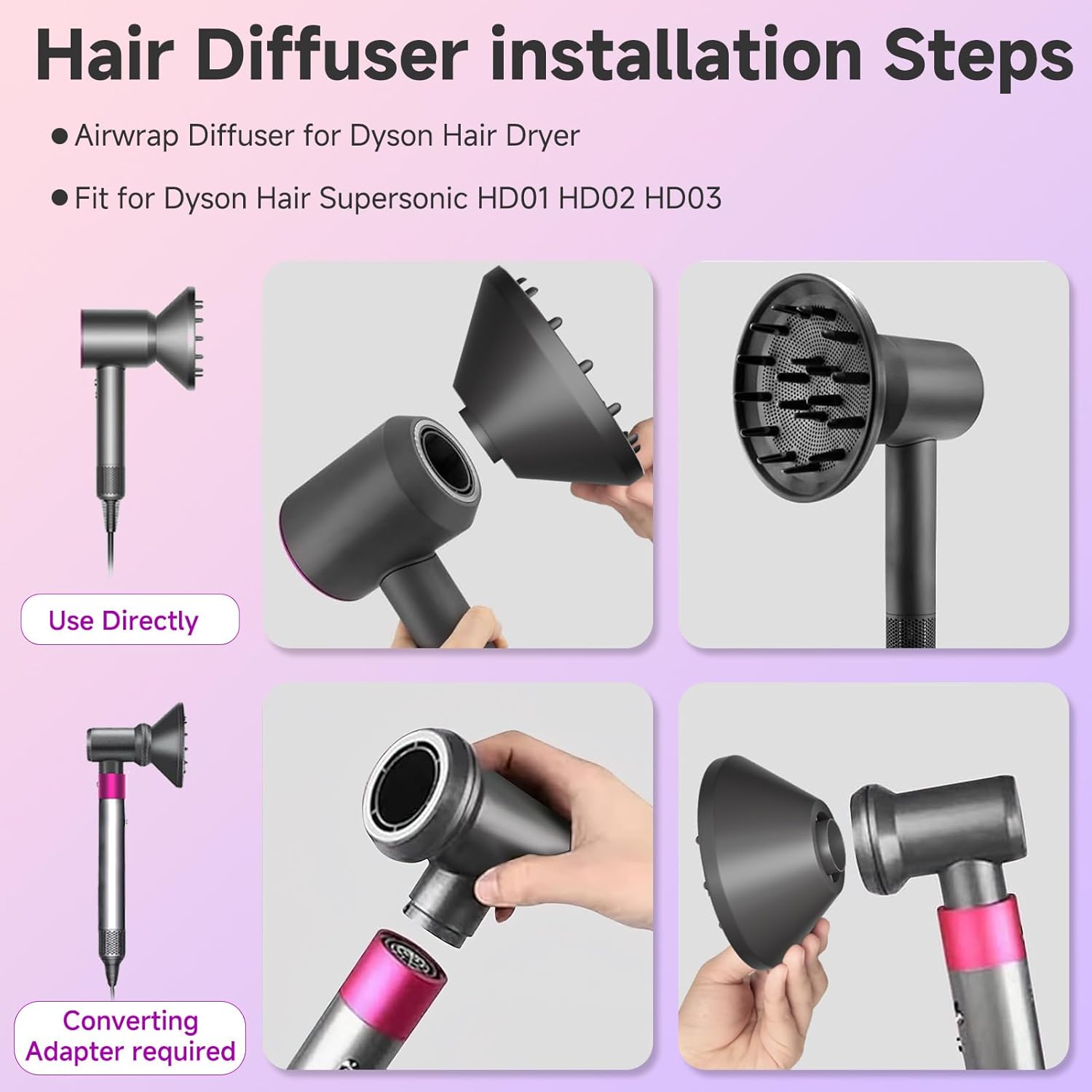 Hair Diffuser Attachment Nozzles for Dy-son Supersonic Hair Dryer HD01 HD02 HD03 HD04 HD08 HD15 Tools Accessaries Parts, Upgraded Magne-tic Diffuser Attachment, Black. Drying & Styling — Our hair dryer diffuser attachment for dy-son evenly disperses air to diffuse curls and waves, helping to reduce frizz and restore your hair’s silky curls. This diffuser is also good for those with straight hair, adding volume and getting beachy waves.