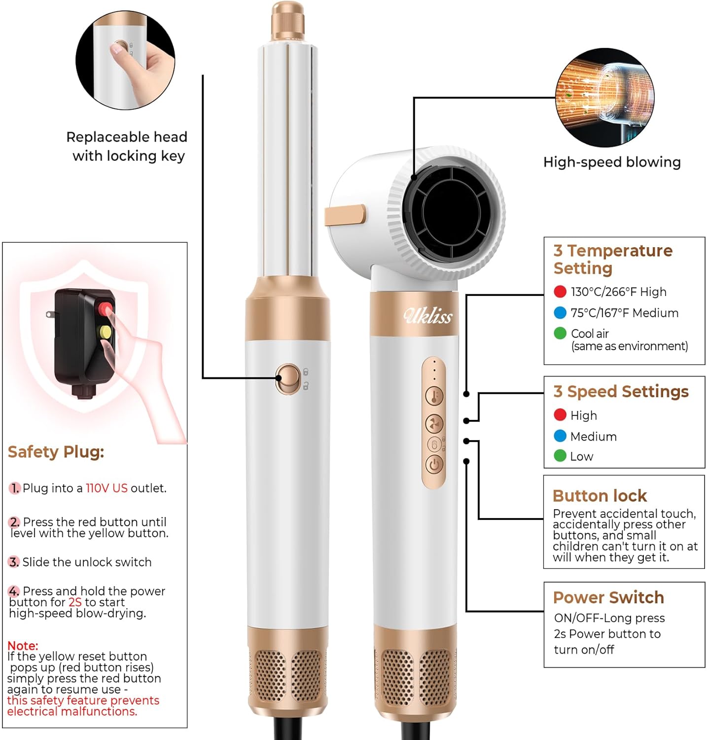 High-Speed Air Styler for Effortless Styling: Experience the power of the UKLISS Hair Dryer Brush, a revolutionary air styler that combines a high-speed motor (up to 110,000 RPM) with a wind speed of 20M/s. This hair dryer brush blow dryer dries and styles your hair six times faster than traditional tools, delivering salon-quality results at home. Perfect for short hair or any hair type, this magic styler ensures efficient, shiny, and damage-free styling every time.