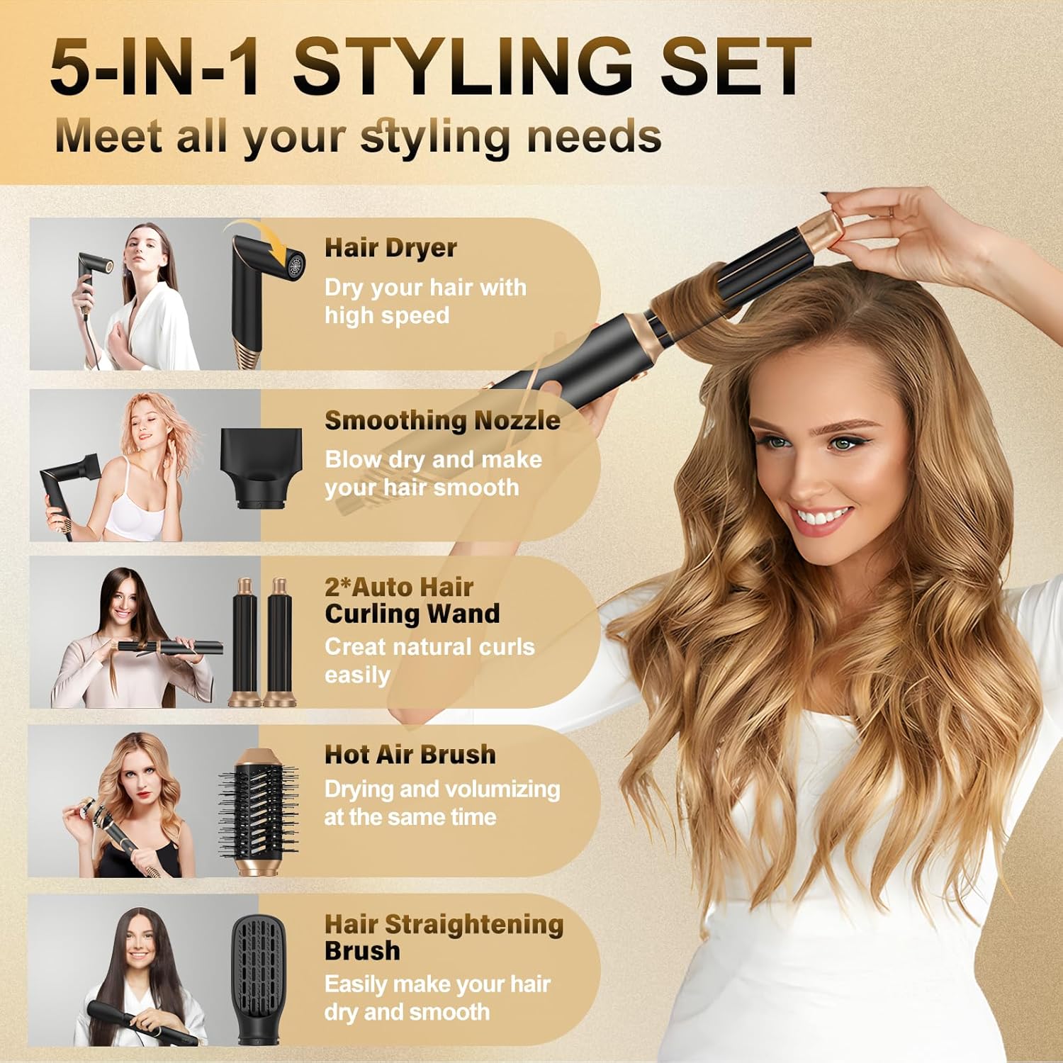 The hot air brush set is equipped with a 1000W high-performance motor, strong wind speed, and five accessories to meet your daily styling needs.