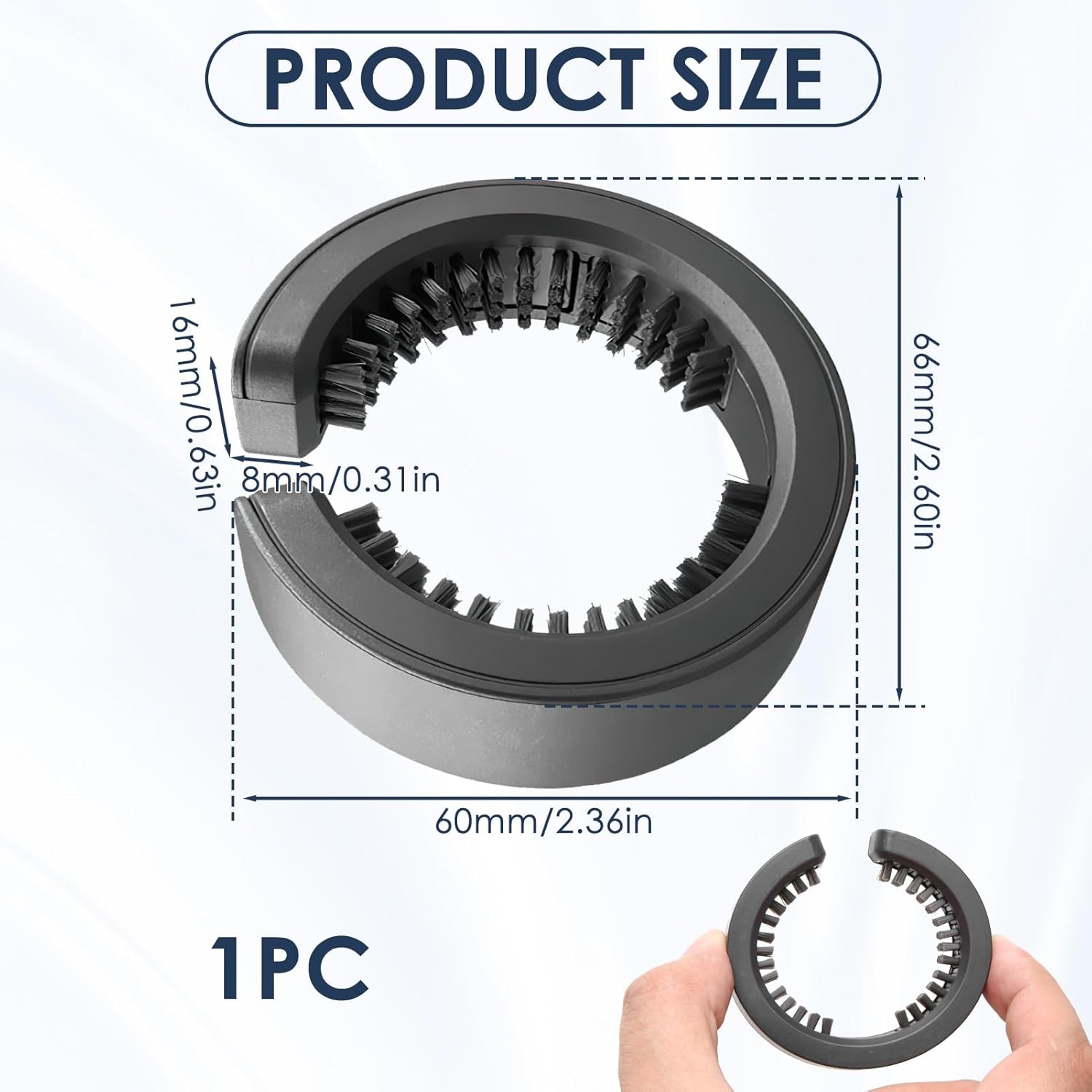 The brush measures 2.6*2.3in,it’s made of soft, flexible bristles that won’t scratch filter screens, paired with a lightweight plastic handle for easy gripping. As round brush attachment, its compact size fits into hair tool bags, making it portable for travel or on-the-go salon use.