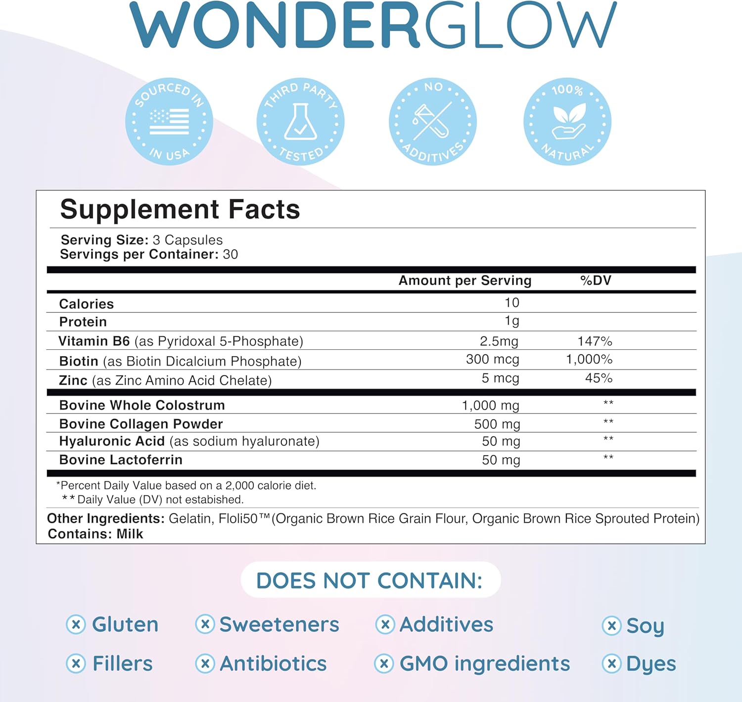 YOUR ALL-IN-ONE BEAUTY SOLUTION: With this winning blend of natural ingredients, WonderGlow offers comprehensive support for your hair, skin, and nails health and beauty from the inside out. Each capsule is packed with essential nutrients that work synergistically to promote strengthened hair and a radiant complexion, smooth texture, and youthful elasticity. Combining the natural benefits of bovine colostrum, collagen, hyaluronic acid, biotin, and lactoferrin, this solution is a beauty cocktail designed to sustain youthfulness and vitality. Revitalize skin cells, increase hydration, reduce fine lines, restore plumpness, and exude a glowing complexion.