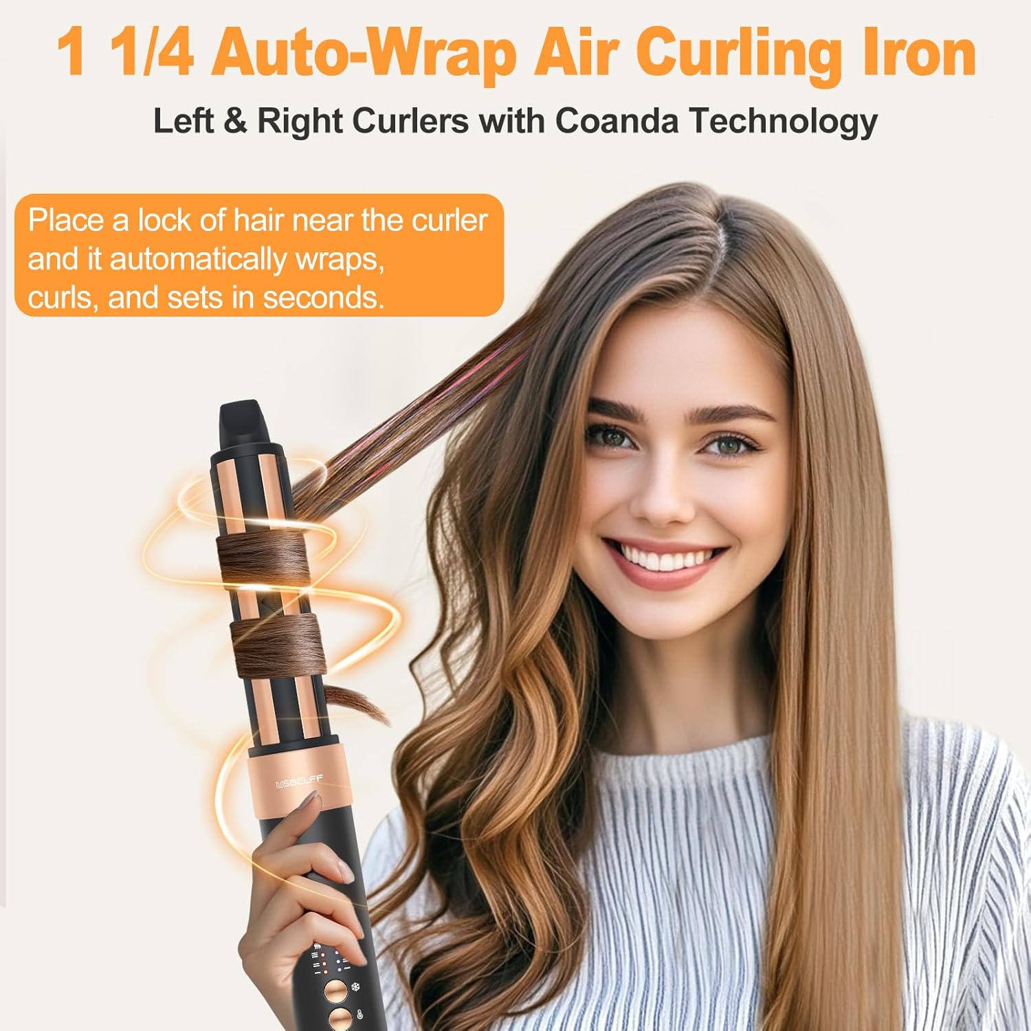 Automatic Wrap Curling Barrels:1 1/4 Inch Auto-wrap curling barrels use high-velocity airflow to attract and wrap sections of hair automatically—no twisting or clamping needed. Create natural, voluminous curls quickly and evenly, suitable for various hair lengths and textures. Includes 2 auto-wrap hair curlers to curl hair in left and right,you can create stunning curls in different directions, allowing you to achieve natural curls effortlessly. Get long lasting curls after using the cool shot button.
