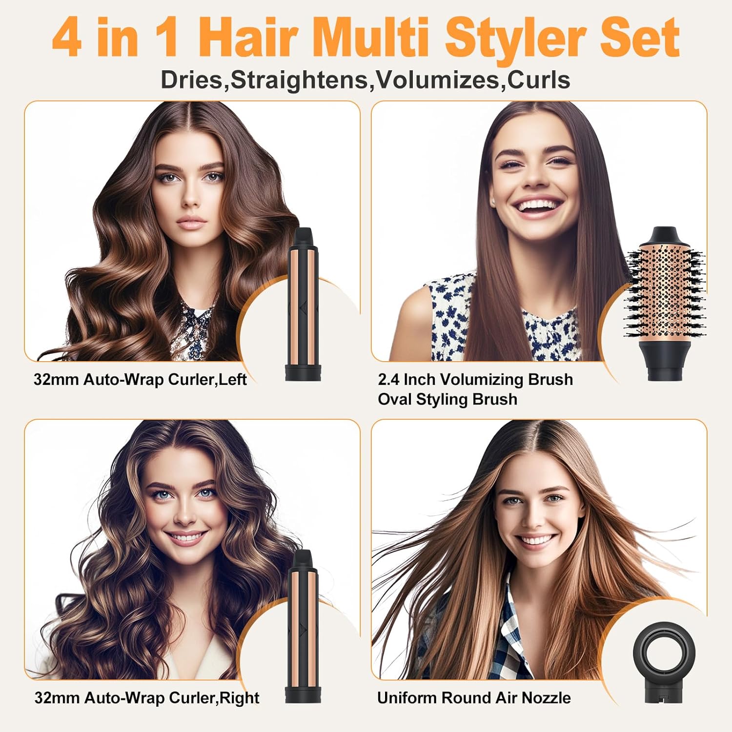 4-in-1 Hair Styler Set-Curl,Volumize,or Straighten with Ease: This professional hair styling tool comes with four interchangeable attachments: a high-speed hair dryer, two auto-wrap curling barrels (1.25”) and a volumizing brush. This Air styler can give you for achieve salon-inspired results at home with ease.Enjoy the freedom to explore various hairstyles without the hassle of juggling different tools, making your styling routine more enjoyable and efficient.