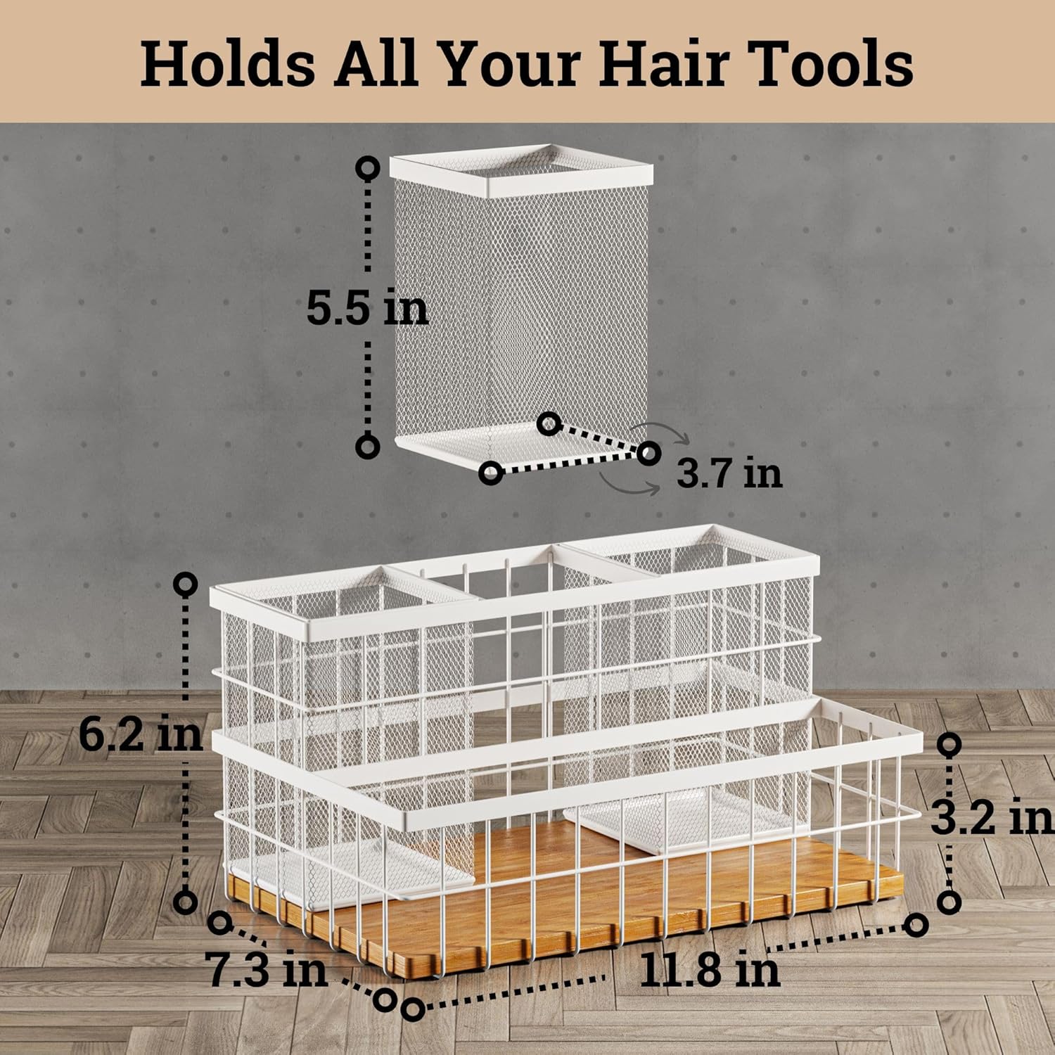 METAL & BAMBOO HAIR APPLIANCE HOLDER – Made from powder coated iron, the frame and baskets are heat resistant, scratch resistant, durable and sturdy. The bamboo base is beautifully varnished to be stain resistant. This hot tools holder is easy to wipe down with a damp cloth.