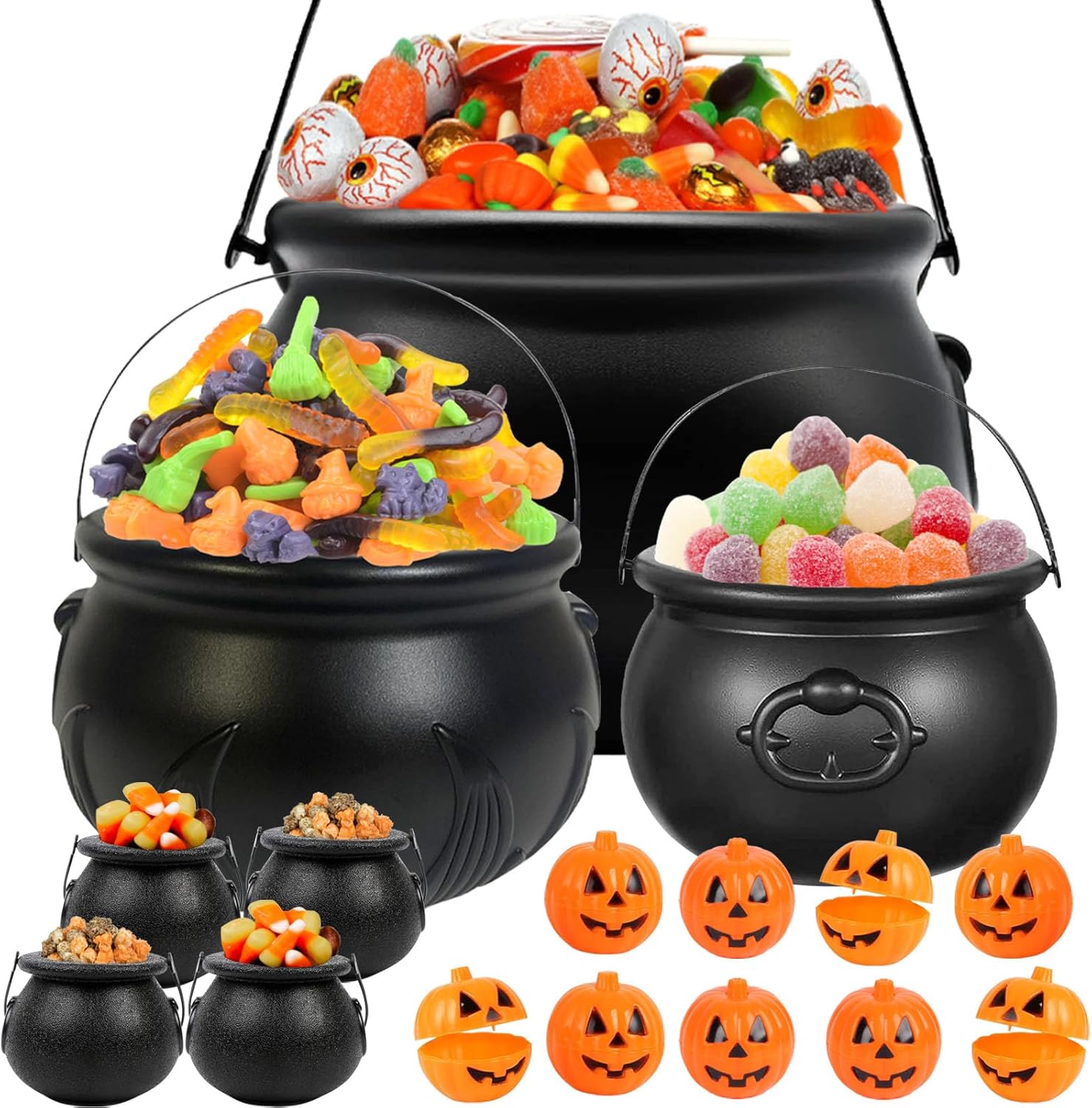 【16-piece Set】: We have prepared 1 black witch pot with a diameter of 12.6 inches, 1 with a diameter of 9.8 inches, and 1 with a diameter of 7.7 inches for you. We also have 4 small candy pots with a diameter of 2.7 inches, 9 orange pumpkin balls of 2.4 inches that can hold candies.