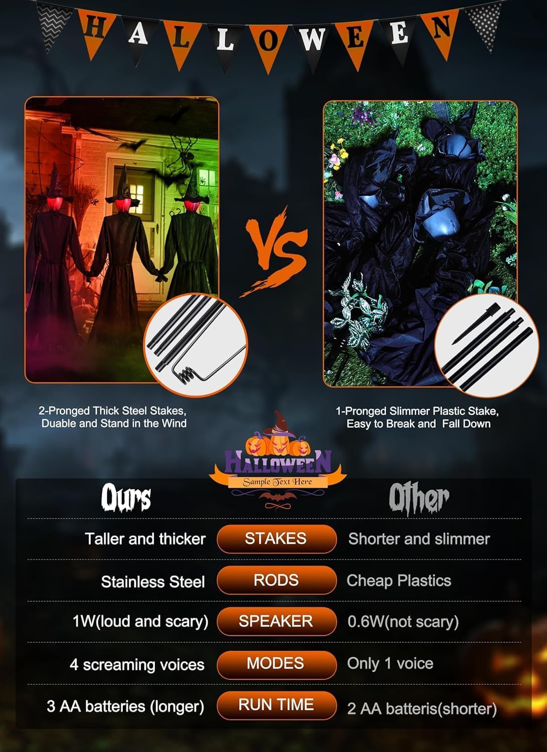 【4 MODES SOUNDS SCREAMING】The creepy scary voice witches have 4 modes for your choice. Halloween witches outdoor with 1W speaker has louder and more scary voice than 0.6W speakers to increase the festive and creepy atmosphere. Ideal scary halloween decorations for your Halloween party or haunted house decorations. Standing witches holding hands are easy to display in your front yard with included stainless steel ground stakes