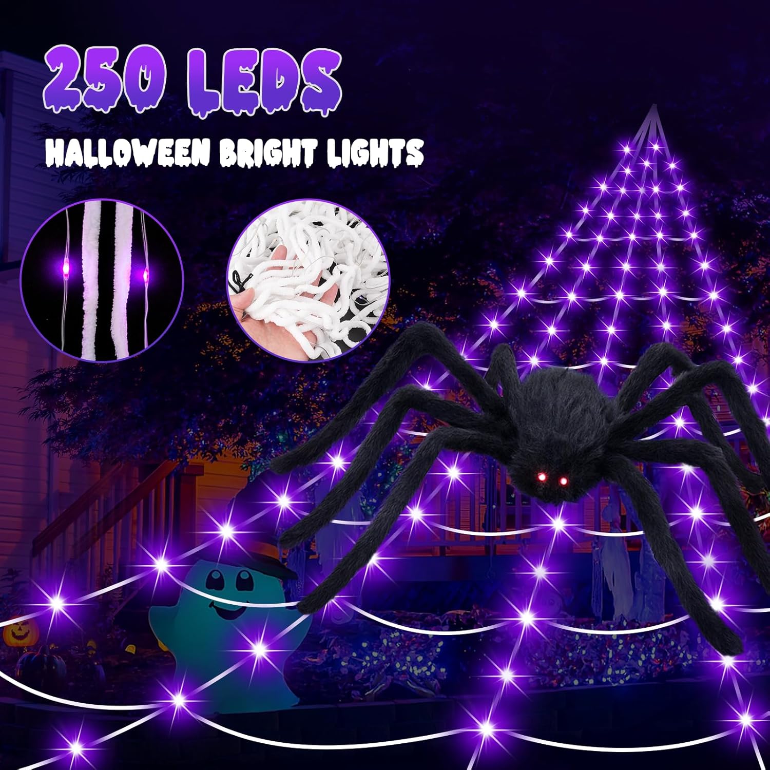 Giant Spider & LED Spider Web Halloween Decorations: Come with a giant triangular 250 LED light up spider web, 59-inch hairy spider, 1 ETL plug, 1 gutter hook, 5 ground stakes, and remote control. Casting an enchanting glow that will captivate your guests and trick-or-treaters alike, making your home a must-visit haunt this Halloween season! Perfect for creating a chilling atmosphere this Halloween!