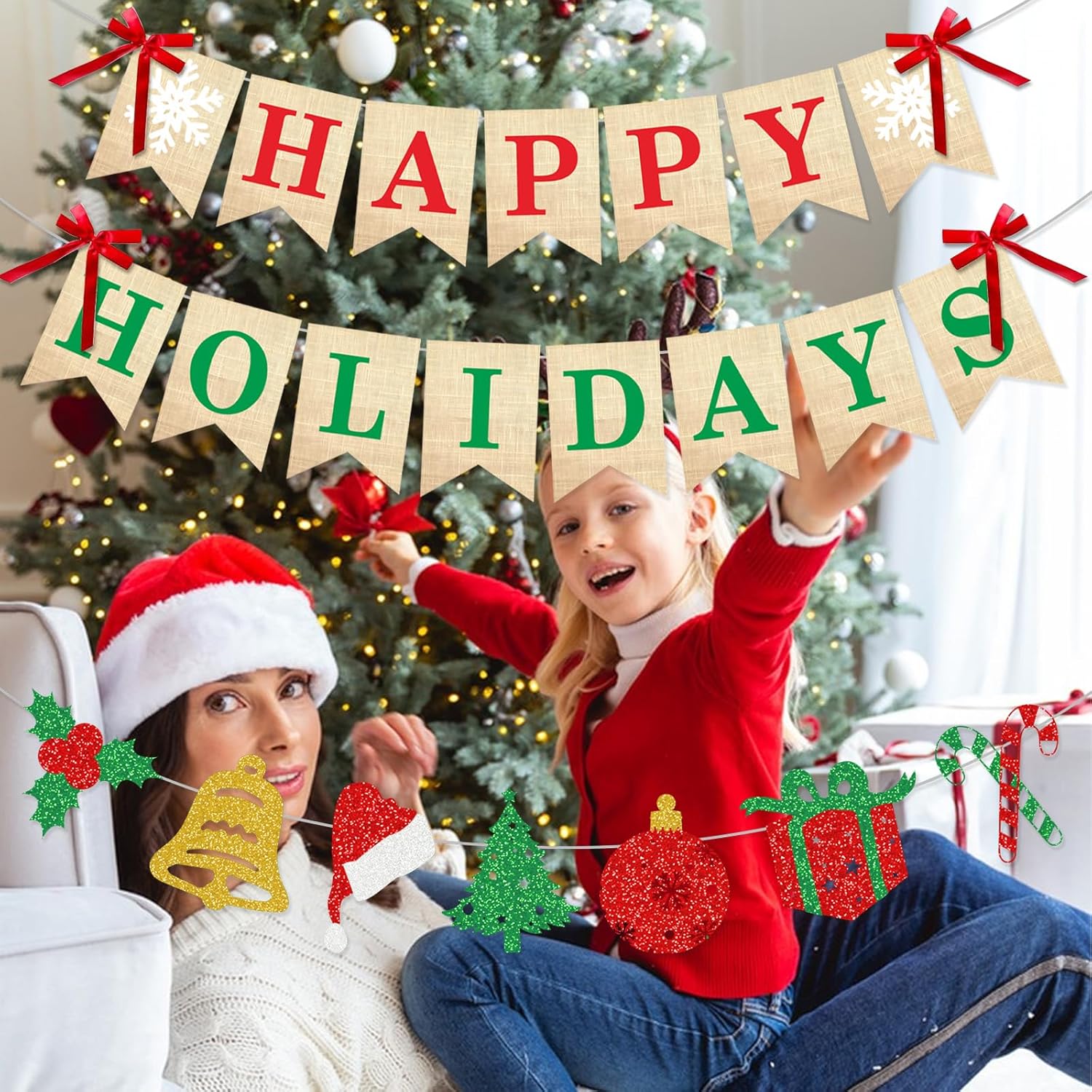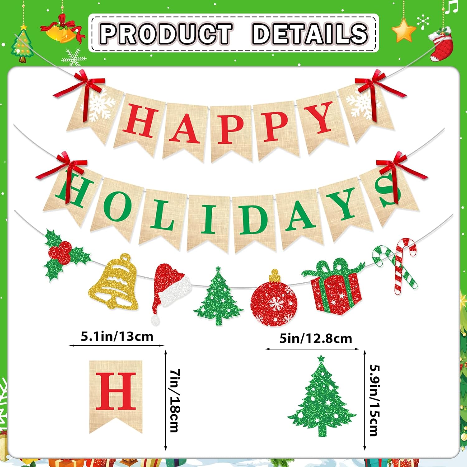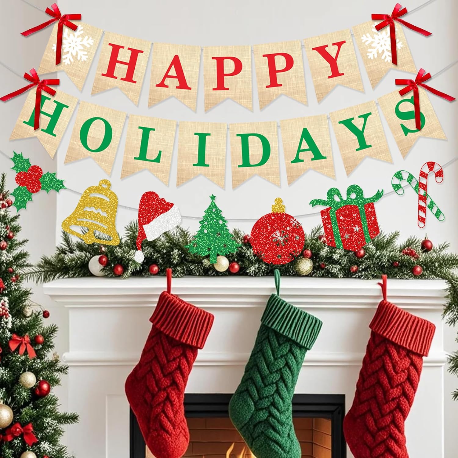 đăPackage Includesă Comes with 1 red HAPPY banner, 1 green HOLIDAYS banner, 4 red bows, and 1 garland with 7 hanging pieces featuring classic elements like candy canes, bells, gifts, and hollyâgreat happy holidays decorations for any festive setup!