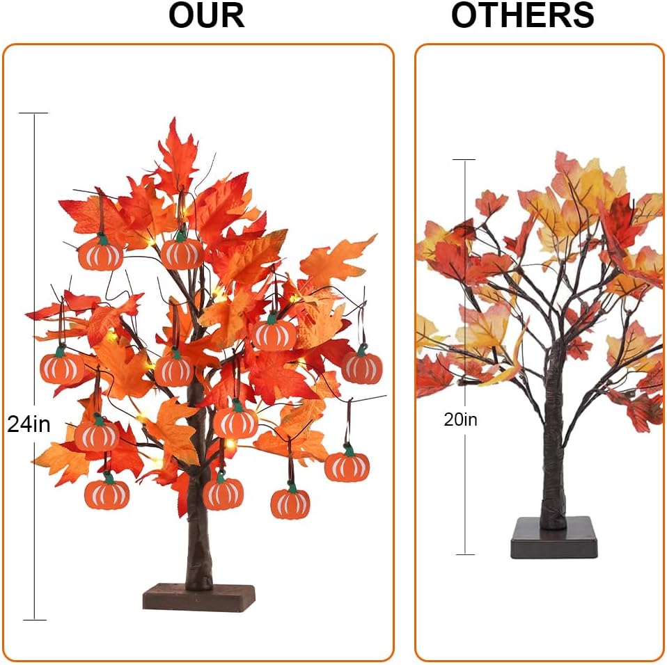 🍁【Special Timer Function】 This 24” 2FT fall maple leaves tree dotted with 24 warm white LED create a soft and magical glow. This LED tree is 3 AA batteries (NOT INCLUDED) powered with timer mode which saves you the hassle of manually turning on and off the light. It will turn your birch tree with light off automatically after 6H of use, and powers back on 18H later.