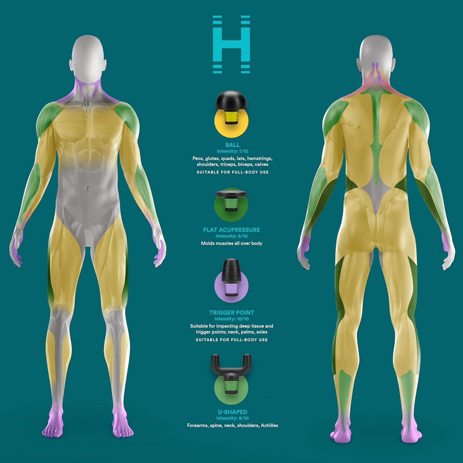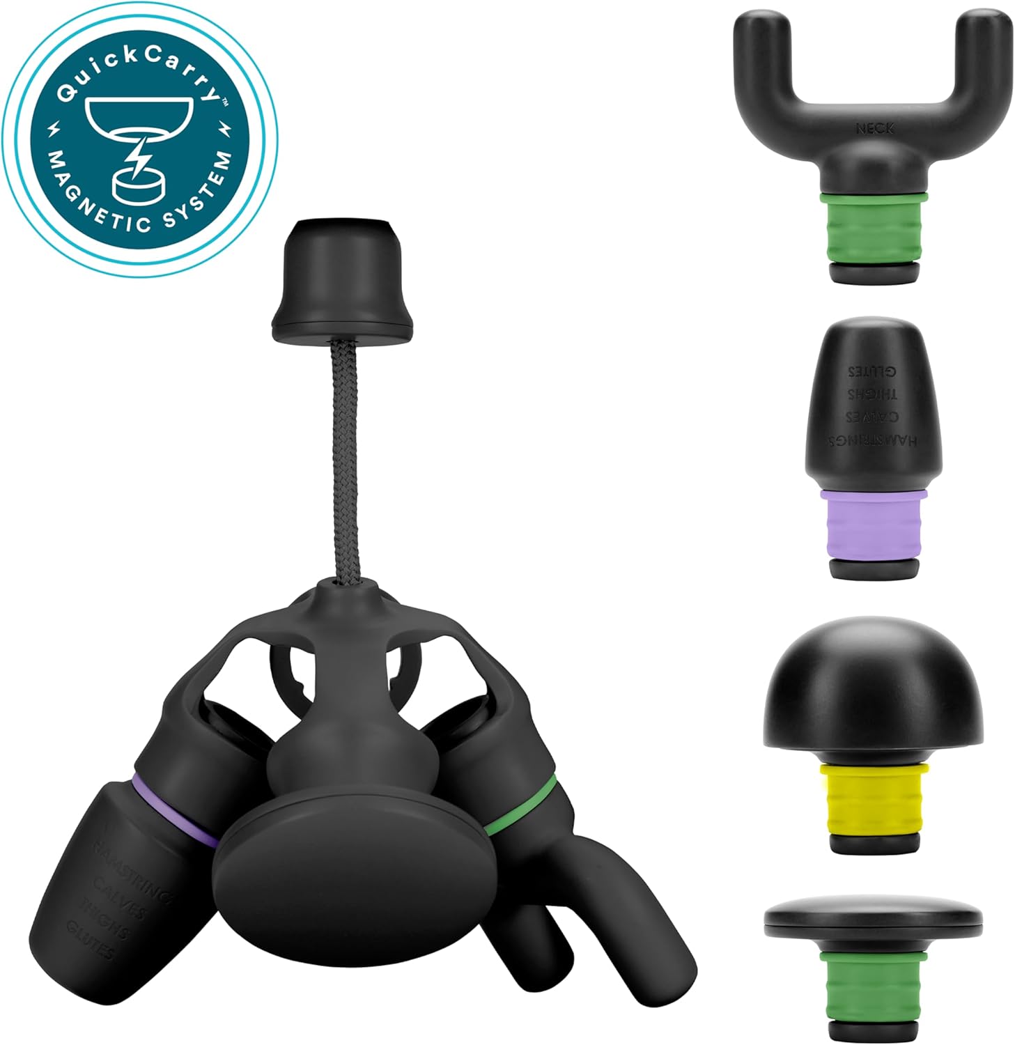 Advanced Attachments: QuickCarry Magnetic System means the right attachment is always with you; 4 attachment heads are clearly labeled to help you target specific muscle groups and color-coded to correspond to each massage program; easily switch between U-Shaped, Ball, Flat, and Point attachments