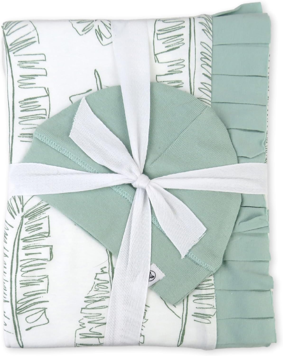 A must-have blanket and cap set! This 2-ply stroller blanket includes a print on one side with a coordinated color on the other and features a decorative trim for a stylish look. Crafted from premium 100% organic cotton that is super-soft and comfy, this blanket will surely become a favorite for snuggles at home or out and about. Top off this cute set with our comfy-fit cap and you are ready to go! This set makes the perfect gift and make sure to add to your registry, because you can never have enough blankets.